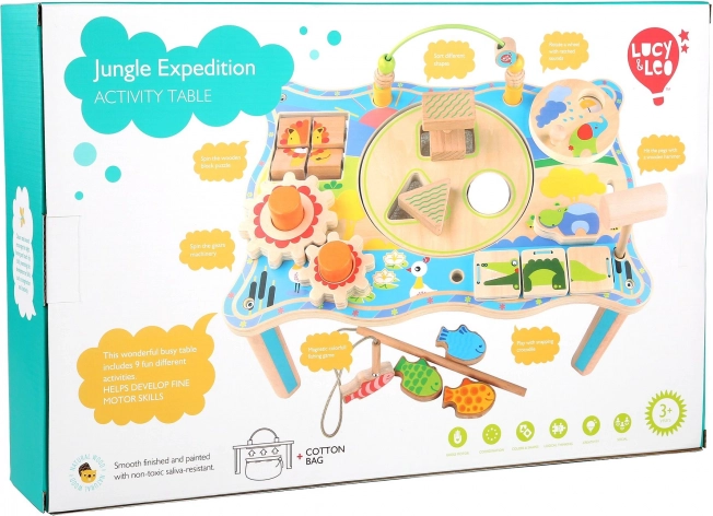Atklājiet izklaidi un mācīšanos vienlaikus ar bērnu galdiņu LUCY & LEO – Ekspedīcija džungļos. Šis kvalitatīvais koka daudzfunkcionālais galdiņš piedāvā plašu aktivitāšu klāstu bērnu prasmju attīstībai: magnētiskā zivju ķeršana, zobrati, bumbiņu labirints, sitamais komplekts un figūru šķirotājs. Izturīgs izpildījums, rotaļīgs dizains un praktisks lina maisiņš detaļu savākšanai nodrošinās ilgas jēgpilnas spēles stundas.