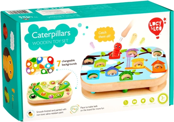Izklaidējoša un izglītojoša spēle Lucy & Leo kāpuru ķeršana attīsta smalko motoriku, loģisko domāšanu un acs–roka koordināciju. Ar magnētiskās nūjiņas palīdzību bērni ķer košus kāpurus koka pamatnes atverēs un izmēģina dažādus grūtības līmeņus ar maināmām kartītēm un rotējošām lapām.