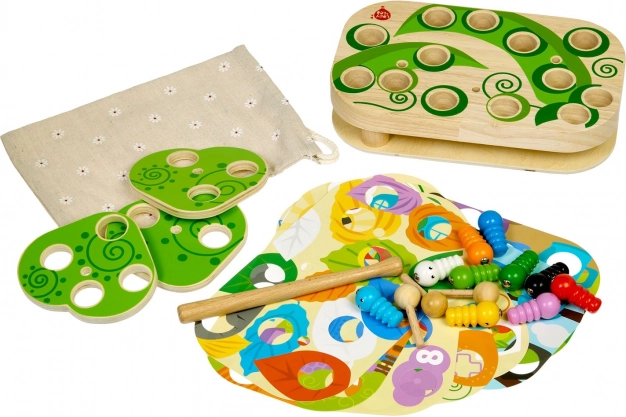 Drošā magnētiskā nūjiņa palīdz bērniem ievietot krāsainos kāpurus atverēs. Attīsta smalko motoriku, koordināciju un pacietību.