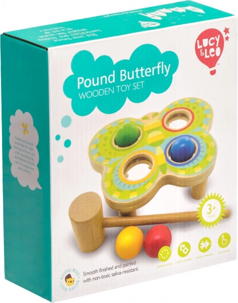 Šī kvalitatīvā koka dauzāmā rotaļlieta tauriņa veidolā iepriecinās bērnus ar košām krāsām un gudru spēles principu. Bērns ar āmuriņu viegli iesit pa krāsainajām bumbiņām, un tās iekrīt atverēs atbilstošajā krāsā, tā trenējot koordināciju un krāsu atpazīšanu.