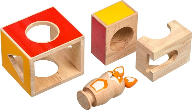 Šī koka izglītojošā spēle ietver trīs masīvus klučus ar dažādu formu izgriezumiem, koka lapsas figūriņu un abpusēju uzdevumu karšu komplektu ar dažādu grūtības pakāpi. Bērni pēc paraugiem veido un kombinē klučus tā, lai lapsa pareizi “paslēptos”, tādējādi trenējot stratēģiju un telpisko uztveri.