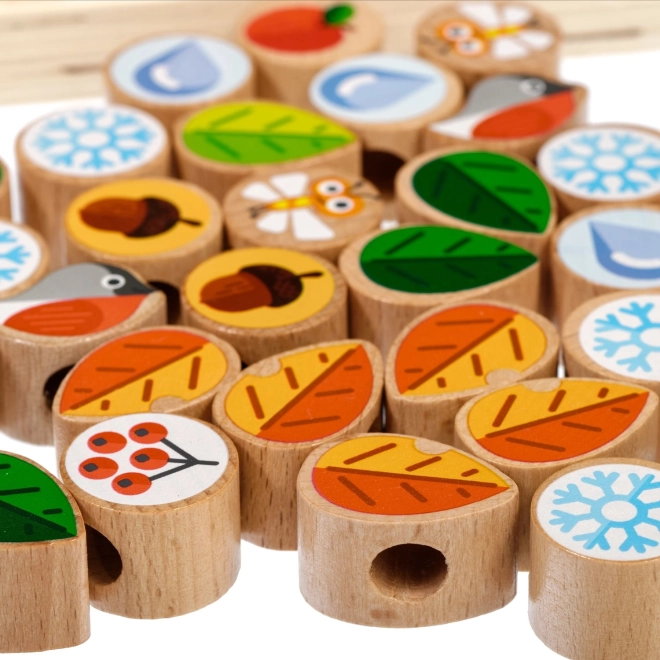 Šis kvalitatīvais koka komplekts piedāvā bērniem aizraujošu vēršanu un šņorēšanu uz stabilas koka koka plātnes ar statīvu. Komplektā ir krāsainas detaļas (lapas, ziedi, ogas, zīles, augļi, sniegpārsliņas, kukaiņi u. c.) un vairākas aukliņas bezgalīgām variācijām. Pēc spēles detaļas var ievietot praktiskā lina maisiņā.
