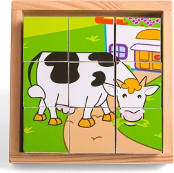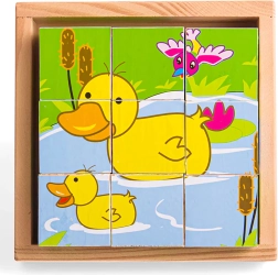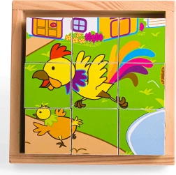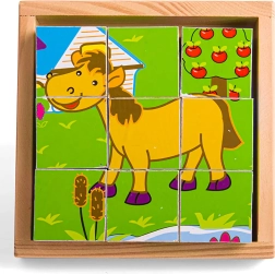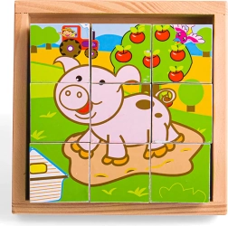 Deviņi izturīgi koka klucīši kopā veido sešus mīlīgus dzīvnieciņu attēlus. Bērni var klucīšus griezt, kombinēt un veidot, kas dabiski attīsta sīko motoriku, veiklību un koncentrēšanos. Komplektā ir iekļauta koka pamatne ērtai salikšanai un drošai uzglabāšanai – ideāli mājās un ceļā.