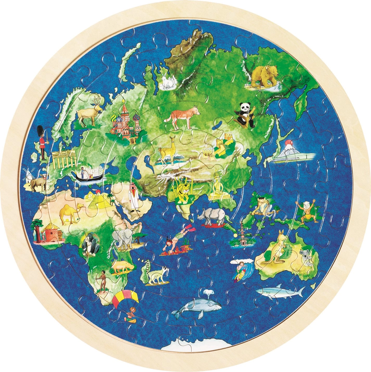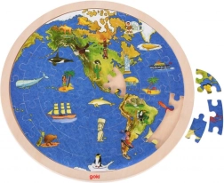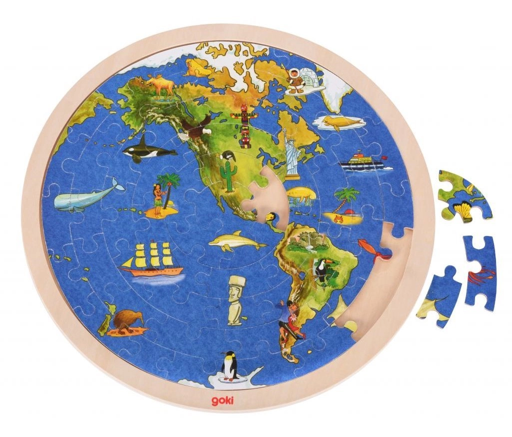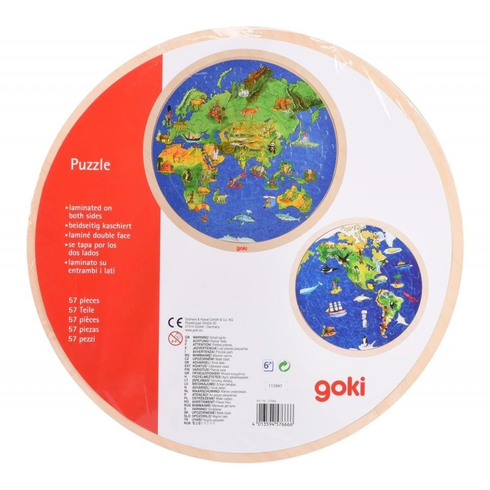 Šī divpusīgā koka puzle GOKI apvieno izklaidi un mācīšanos. Katra puse attēlo vienu puslodi ar izteiksmīgām kontinentu, dzīvnieku un ievērojamu vietu ilustrācijām, kas mudina bērnus iepazīt pasauli. Perimetra frēzētā mala palīdz salikšanā un paaugstina panākumu iespēju arī mazākiem bērniem.