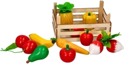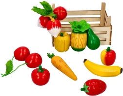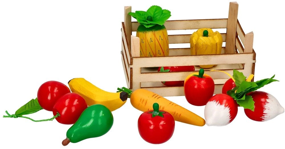 Koka kaste, pilna ar augļiem un dārzeņiem mazajiem pavāriņiem un pārdevējiem, ideāls palīglīdzeklis rotaļām veikalā vai tirgū.
