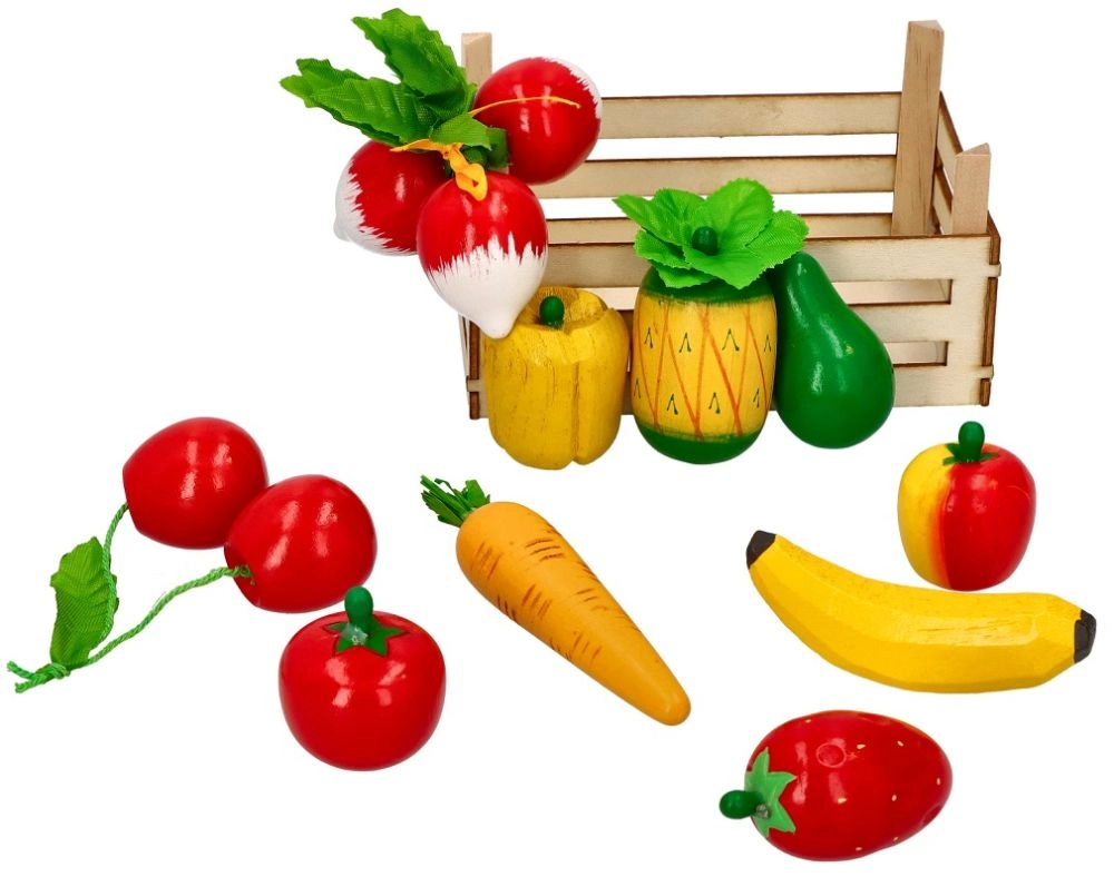 Mazajiem pavāriņiem patiks šis košais koka augļu un dārzeņu komplekts. Lielisks papildinājums jebkurai bērnu virtuvei un tirdzniecības stendam.