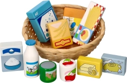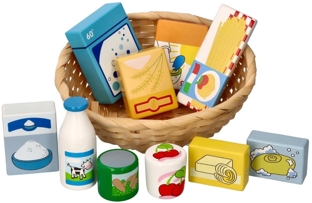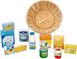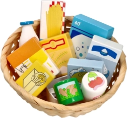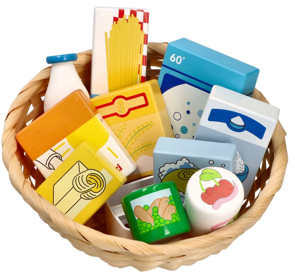 Šis mīlīgais veikala spēles komplekts ietver izvēli no koka pārtikas produktiem dabīgā pītā grozā. Pateicoties reālistiskajam izskatam un spilgtajām krāsām, bērni attīsta vārdu krājumu, sīko motoriku un sociālās prasmes, spēlējot pārdevēju un pircēju.