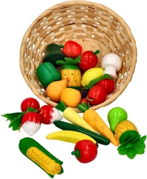 Komplektā ietilpst daudzveidīga augļu un dārzeņu izlase ar košām krāsām, kas veicina vizuālo uztveri un produktu nosaukumu apgūšanu.