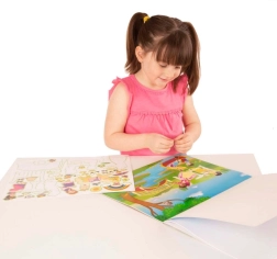 Lielizmēra pamatnes ar izmēriem 35,5 × 28 cm ir izturīgas un pārskatāmas, tāpēc bērniem ar tām ir ērti darboties. Uzlīmes labi turas un vienlaikus viegli noņemamas – bez nekārtības un bez līmes.