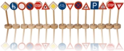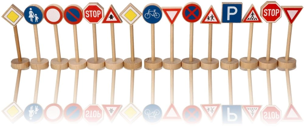 Ietver daudzveidīgu zīmju klāstu, piemēram, Stop, Gājēju pāreja un Autostāvvieta. Katra zīme ir 11 cm augsta, lai būtu viegli satverama.