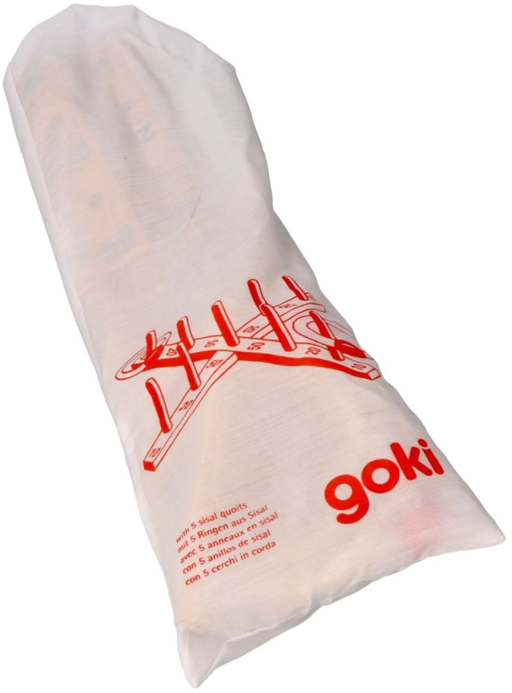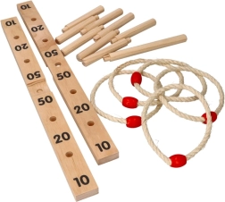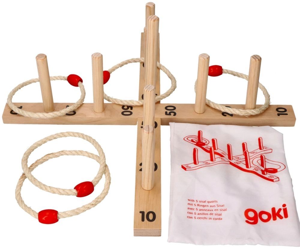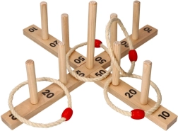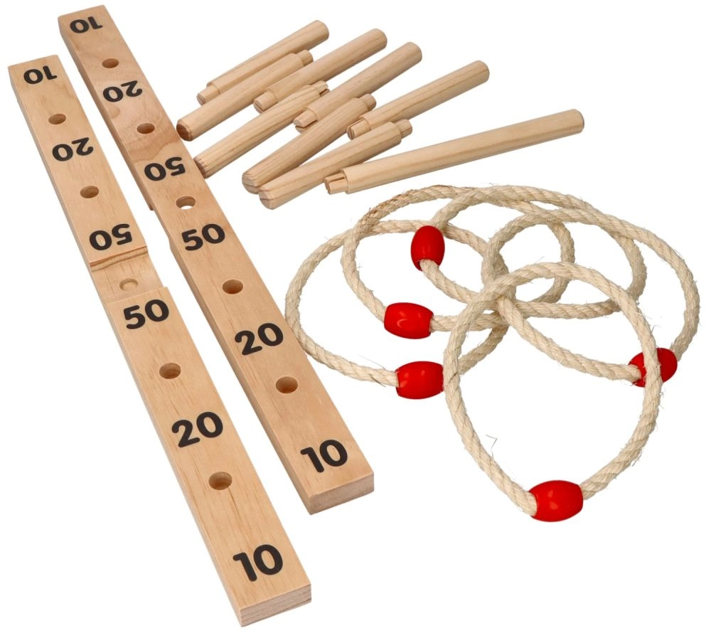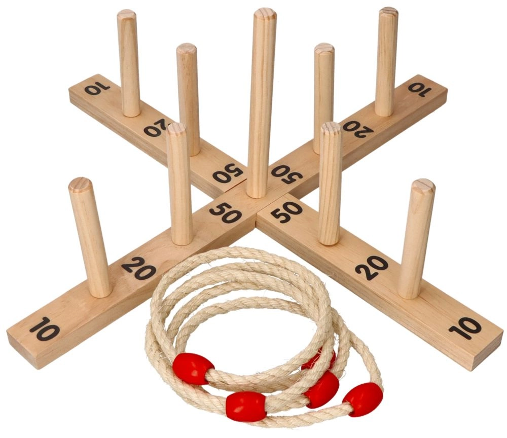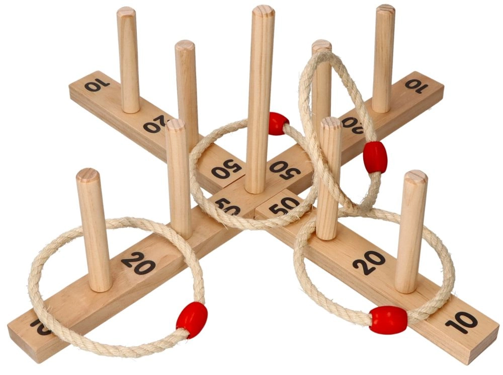Šajā spēlē ir krusta formas pamatne ar 9 koka stabiņiem un pieci auklas riņķi ar koka elementu ērtākai mešanai. Spēle ir izgatavota no kvalitatīva koka, kas nodrošina ilgstošu izklaidi.