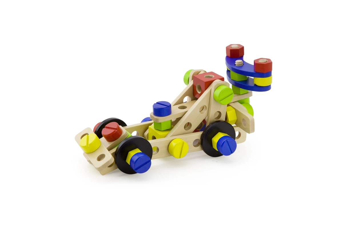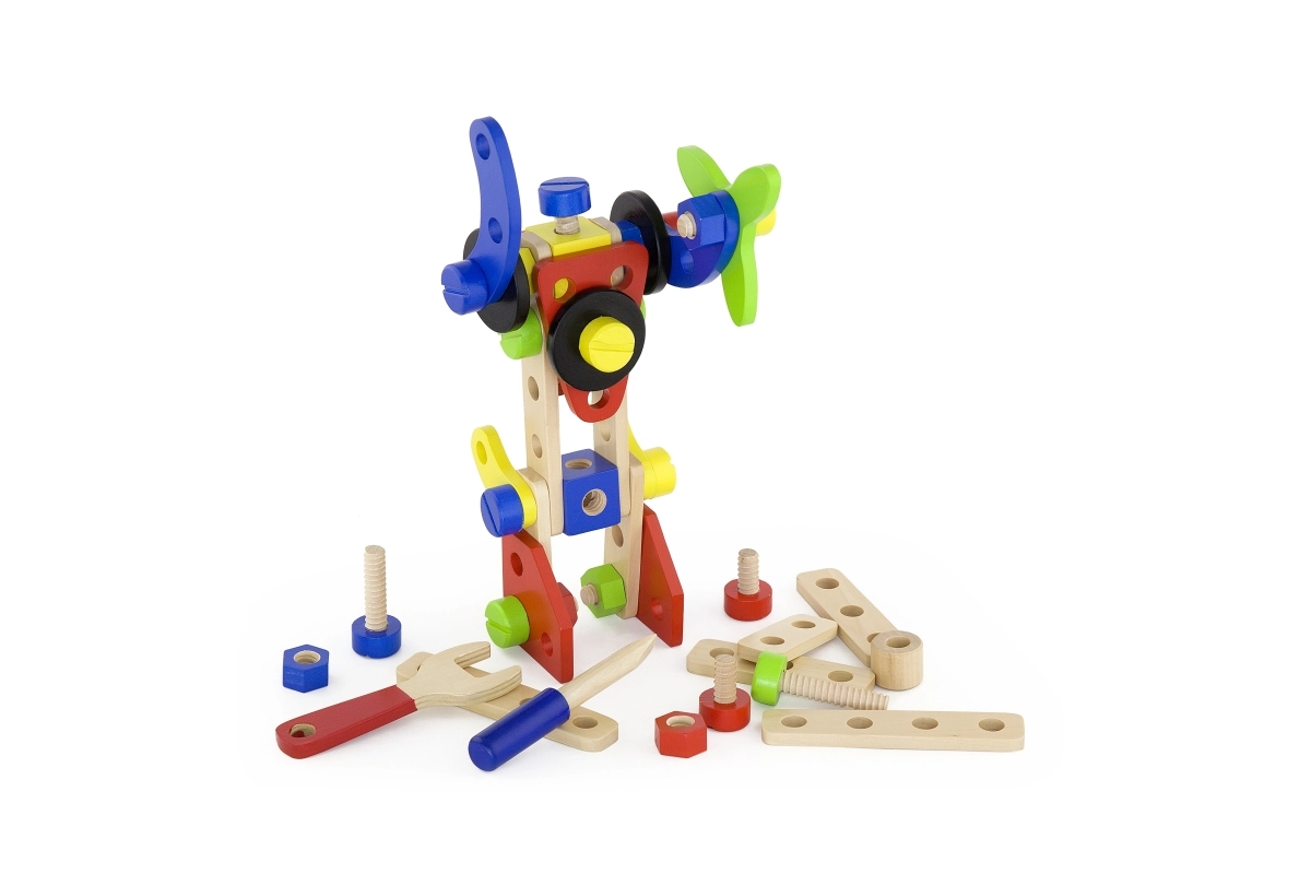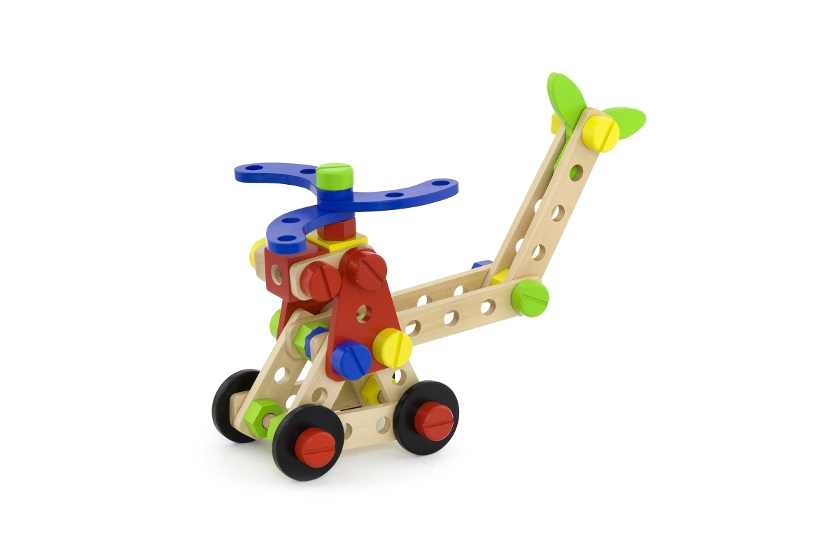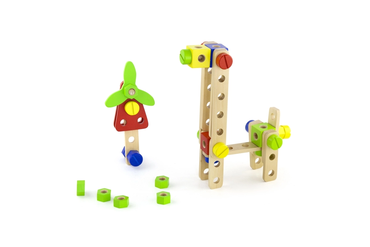 Šis universālais koka konstruktors piedāvā bērniem bezgalīgas būvēšanas iespējas – no ratiņiem un dzīvniekiem līdz helikopteram vai robotam. Pateicoties izturīgajām koka detaļām, skrūvēm un savienojumiem, bērni trenē acu–roku koordināciju un apgūst konstruktīvās domāšanas pamatus.