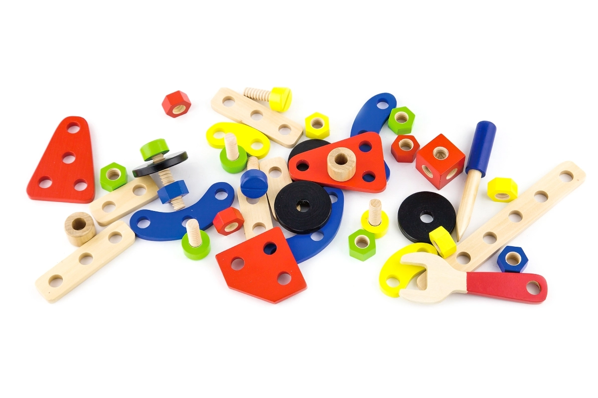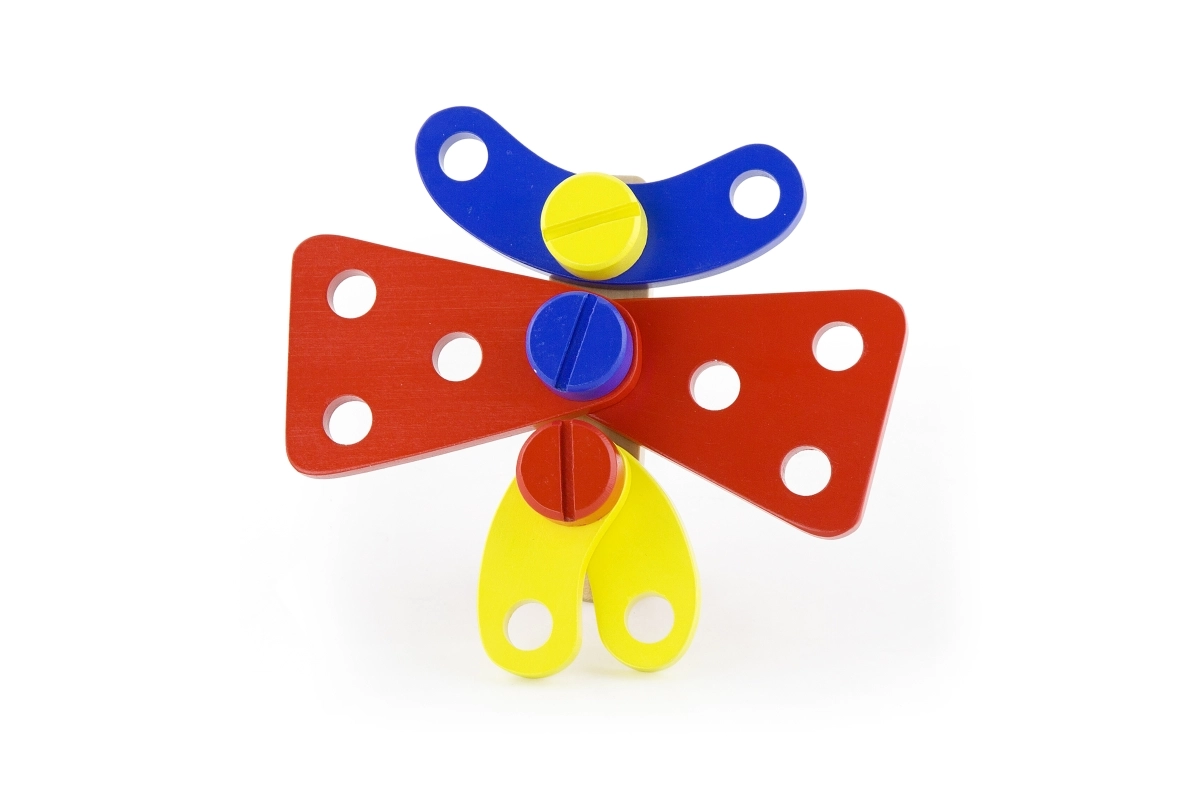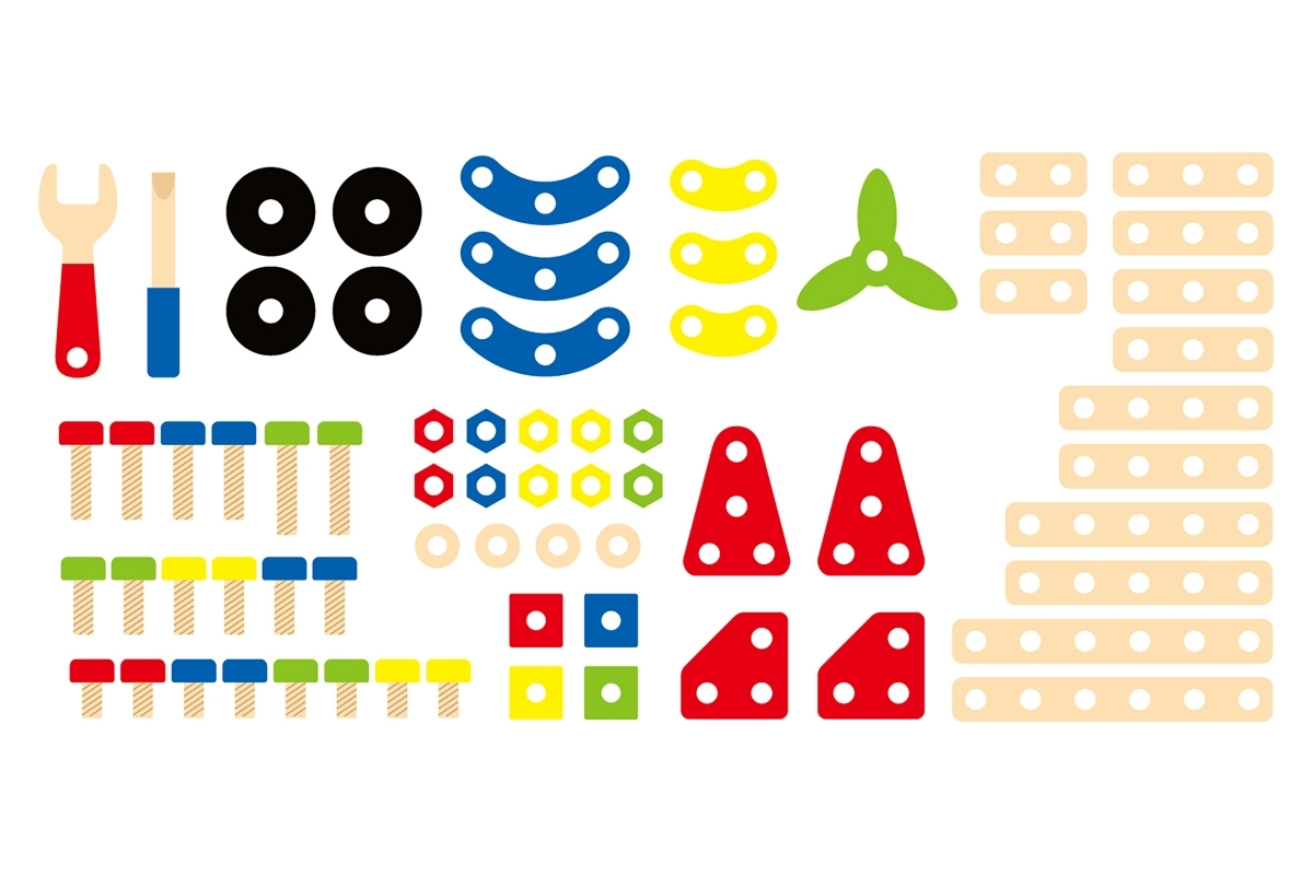 Daudzveidīgs skrūvju, uzgriežņu, plāksnīšu un ritenīšu klāsts ļauj izveidot desmitiem modeļu – no dzīvniekiem līdz ratiņiem un helikopteriem. Ideāli iztēles un pacietības attīstīšanai.