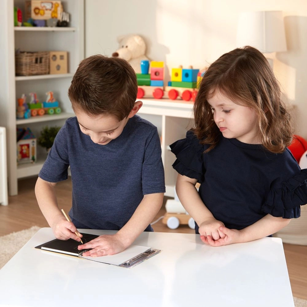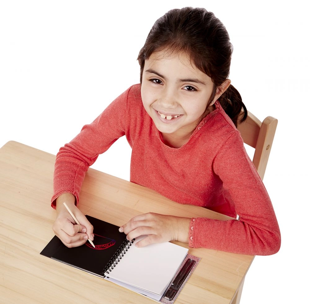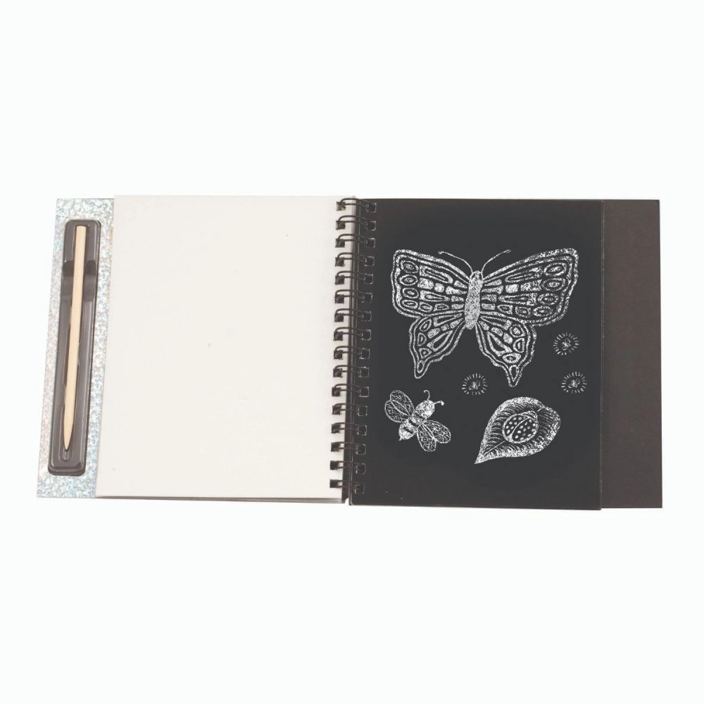 Skrāpējamais piezīmju bloks sniedz radošu izklaidi bērniem no 4 gadu vecuma. Pietiek viegli noskrāpēt virsmu, un zem melnās kārtas atklājas košas krāsas un raksti. Lieliska izvēle sīkās motorikas, koncentrēšanās un radošuma attīstībai.