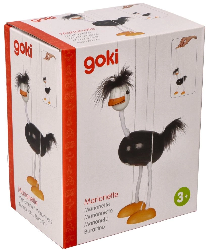 Marionetei ir melns korpuss, baltas kājas un galva ar izteikti oranžām pēdām. Maigas un mīlīgas detaļas uz galvas un astes piešķir tai rotaļīgu izskatu. Bērniem patiks, kā šis strauss kustas un cik viegli to vadīt.