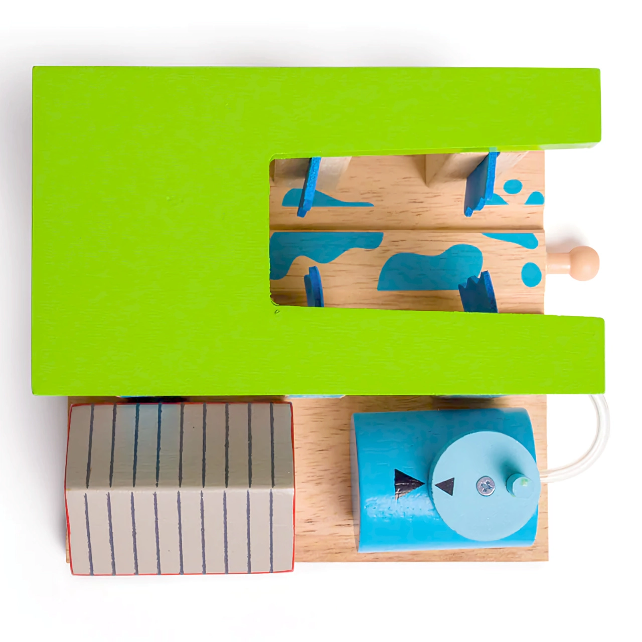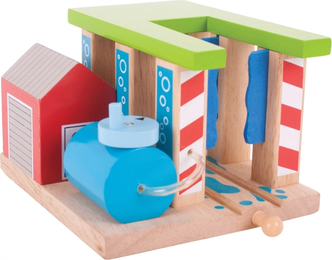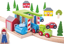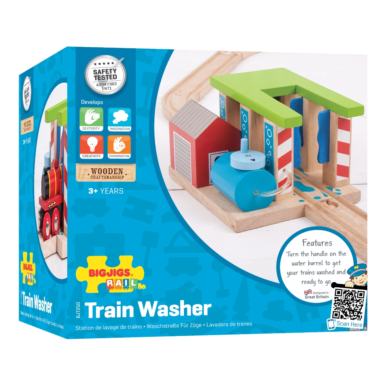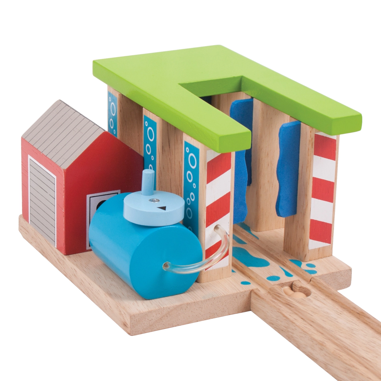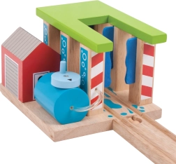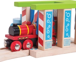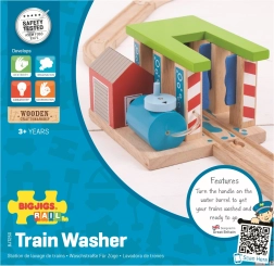 Produkts ir izgatavots no kvalitatīviem un atbildīgi iegūtiem dabīgiem materiāliem un atbilst aktuālajiem Eiropas drošības standartiem. Pateicoties universāliem izmēriem, mazgātava ir saderīga ar lielāko daļu koka sliežu un vilcieniņu tirgū. Vilciens nav iekļauts komplektā, kas ļauj to viegli savienot ar jau esošajiem komplektiem.