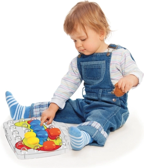 QUERCETTI Mozaīka Pixel Baby ir radoša rotaļlieta mozaīku veidošanai, ievietojot krāsainas pogas perforētā dēlī pēc piedāvātajiem paraugiem vai pēc savas fantāzijas. Šis produkts veicina krāsu atpazīšanu, sīko motoriku un kustību koordināciju.