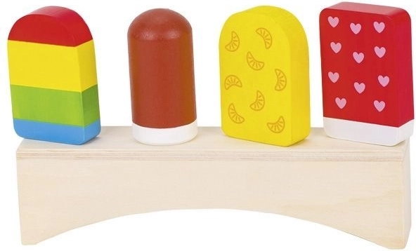Komplektā ir 4 dažādi koka saldējumi, katrs ar unikālu dizainu, lai ikviens atrastu savu iecienīto. Šīs rotaļlietas ir ideāli piemērotas bērniem, kuriem patīk pārdevēja vai pircēja lomu spēles. Koka pamatne piedāvā lielisku iespēju izkārtot saldējumus uz plaukta vai rotaļu galda.