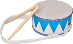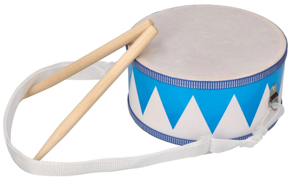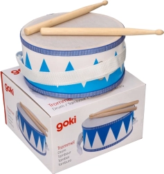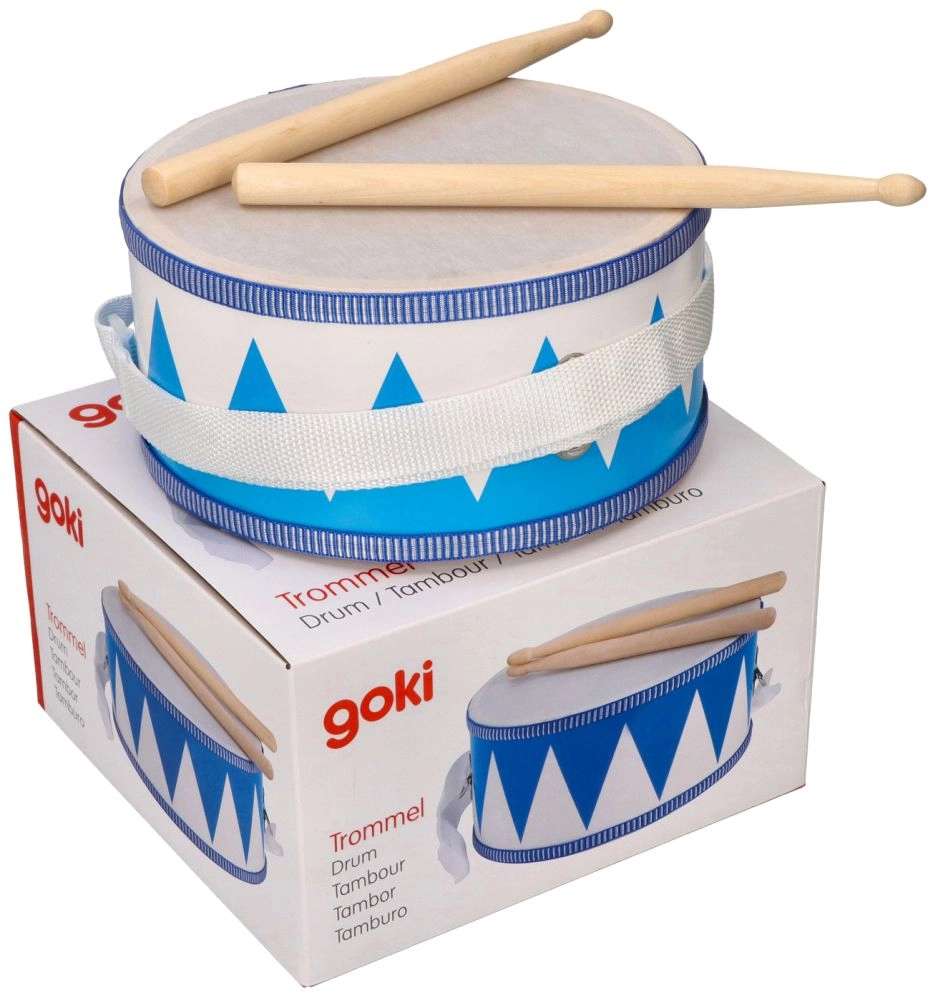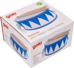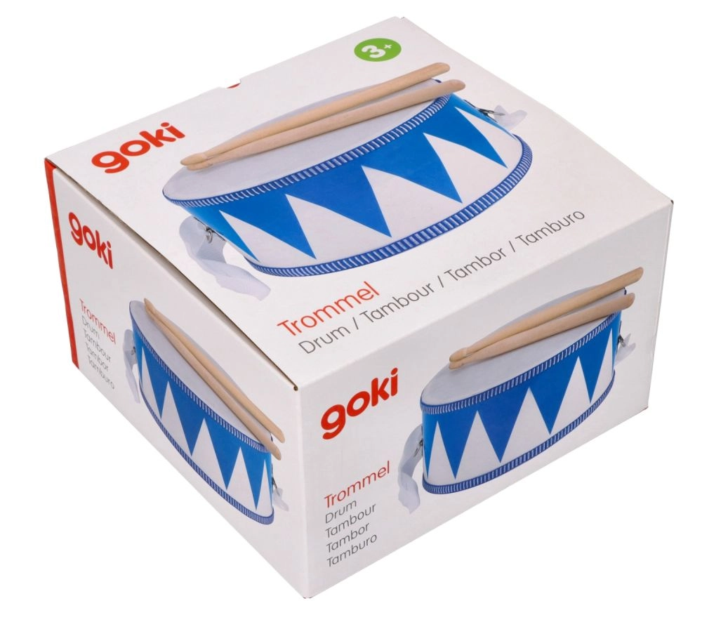 Šīs bērnu bungas no zīmola Goki ir aprīkotas ar siksnu ērtai karināšanai uz ķermeņa, kas ļauj bērniem spēles laikā brīvi lietot abas rokas.