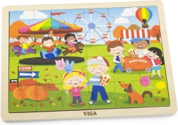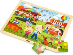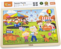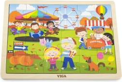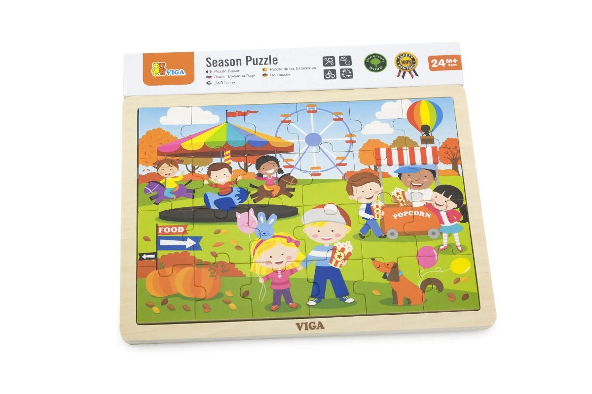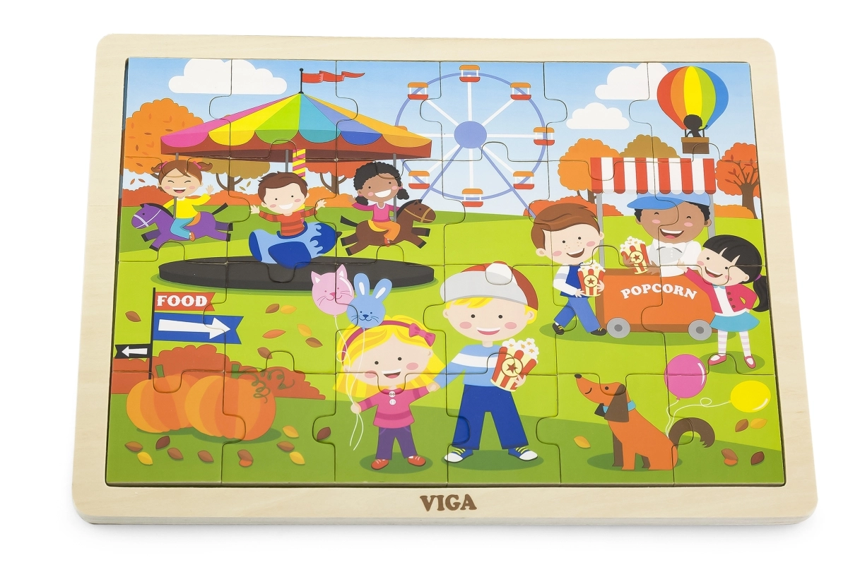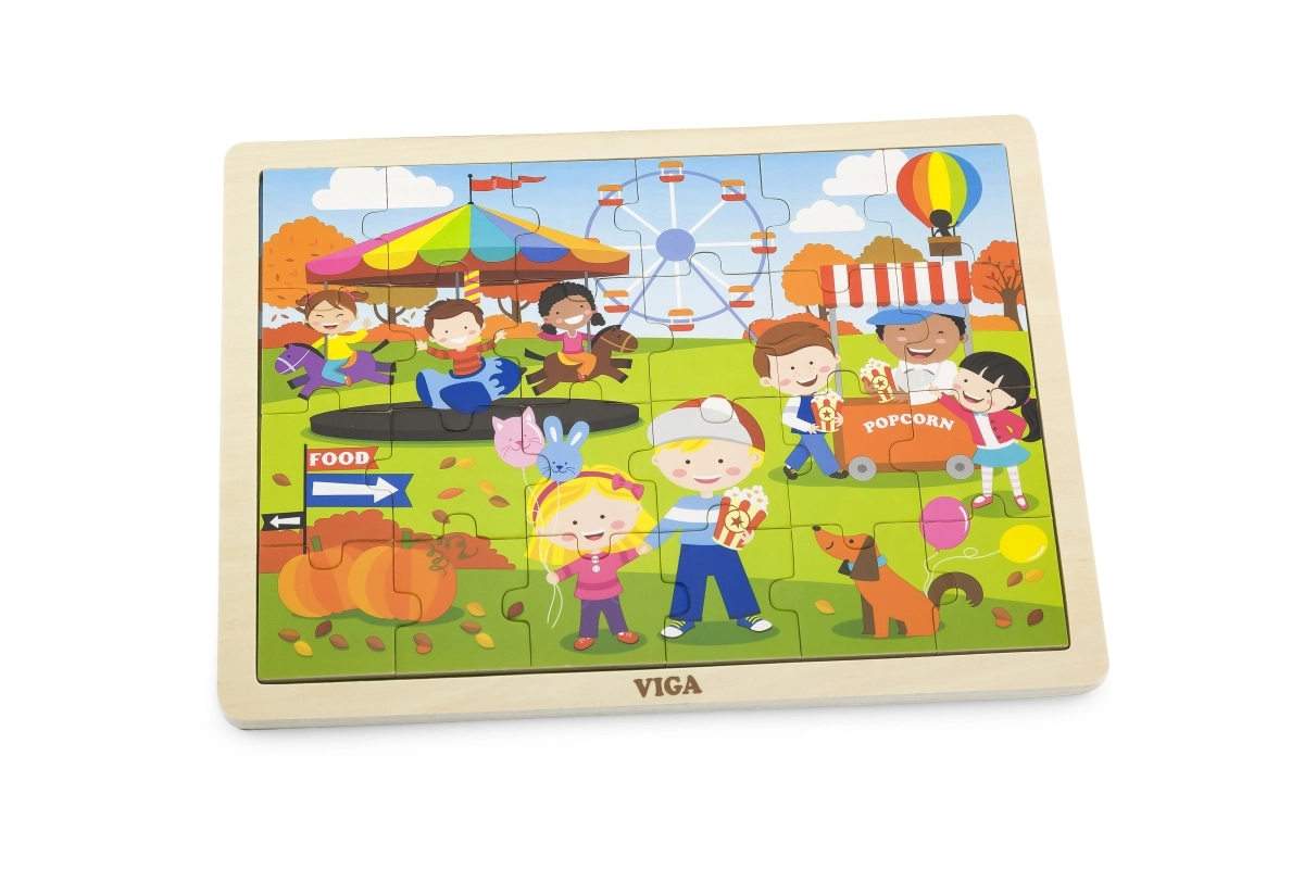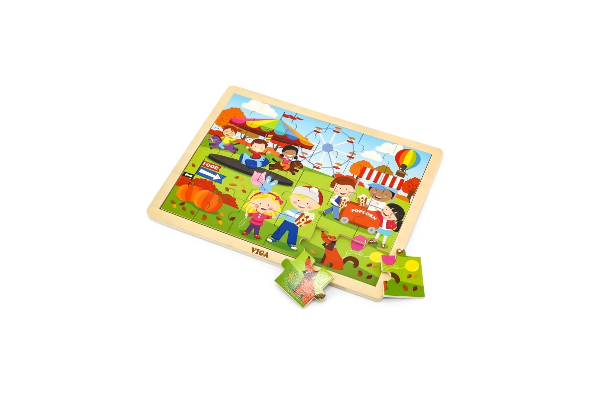 Mīlīgā koka puzle VIGA ar rudens gadatirgus motīvu sniedz bērniem no 2 gadu vecuma gan izklaidi, gan mācīšanos. Tā satur 24 gabaliņus stingrā rāmī ar izmēru 27,5 × 20 cm un lieliski veicina sīko motoriku, loģisko domāšanu un pacietību.