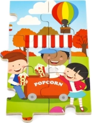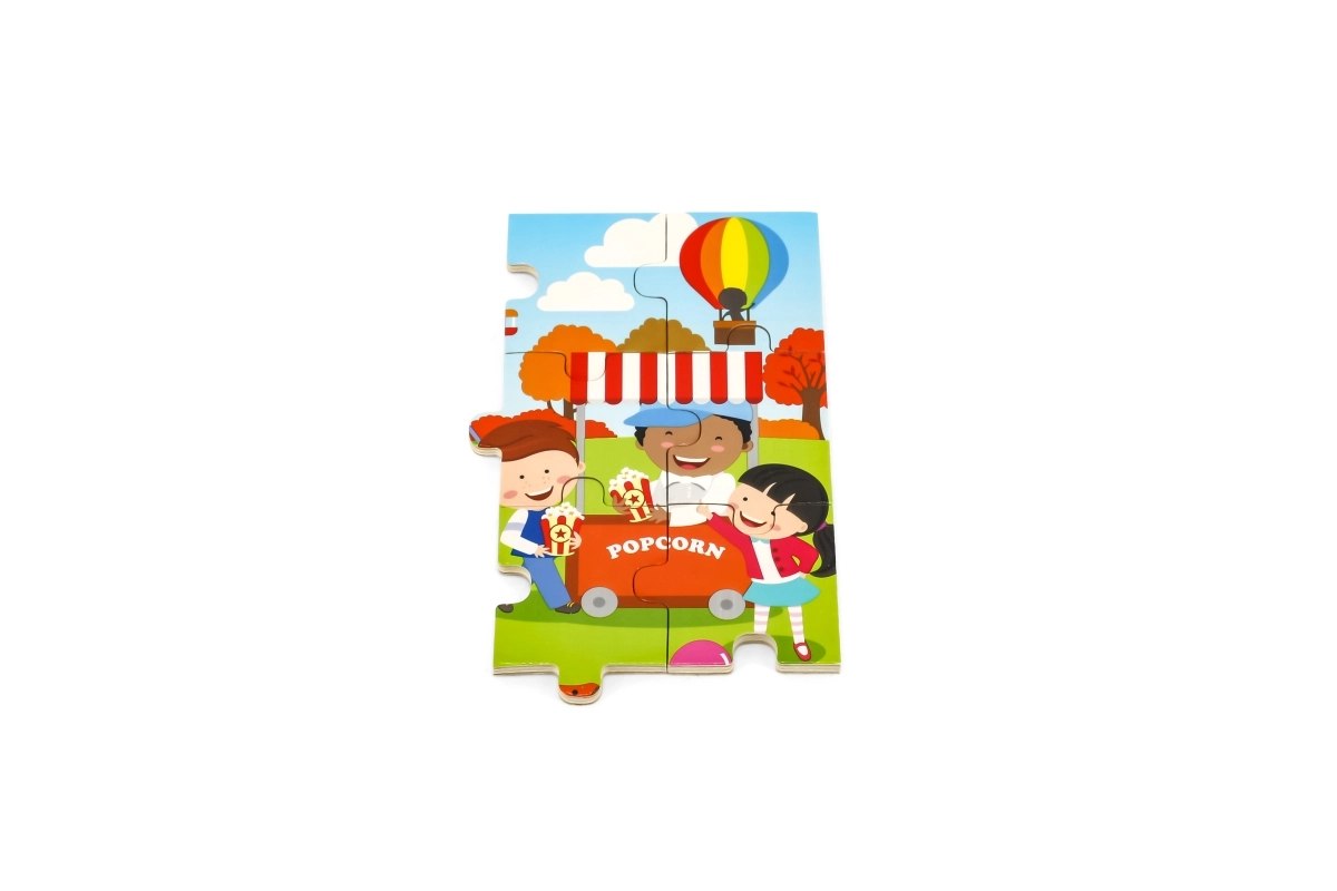 Atklājiet kvalitatīvu koka puzli bērniem ar jautru rudens gadatirgus ainu. Pateicoties 24 izturīgiem gabaliņiem un rāmim, puzli viegli salikt arī mazākiem bērniem, kuri spēles laikā dabiski trenē acu–roku koordināciju un formu un krāsu uztveri.