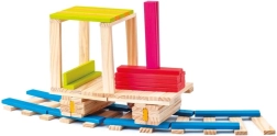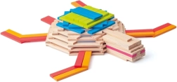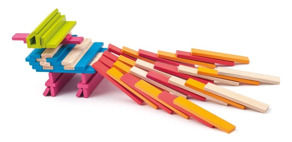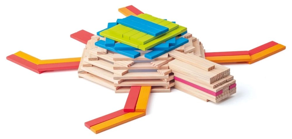 Vienādās plāksnītes viegli saliekamas torņos, tiltos, dzīvniekos un transportlīdzekļos. Bērni trenē fantāziju un plānošanu, un būves saglabā stabilitāti.