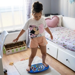 Bērns stāv uz dēļa un, pārnesot svaru, virza bumbiņas pa trasi. Izklaidējoša motivācija kustībai veicina stabilitāti un koncentrēšanos.