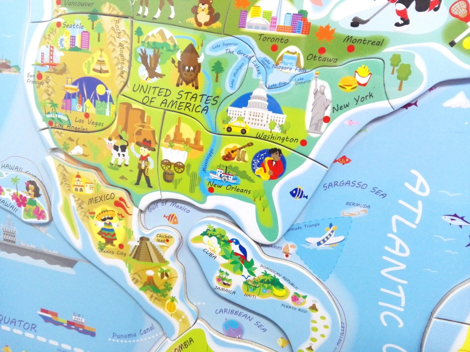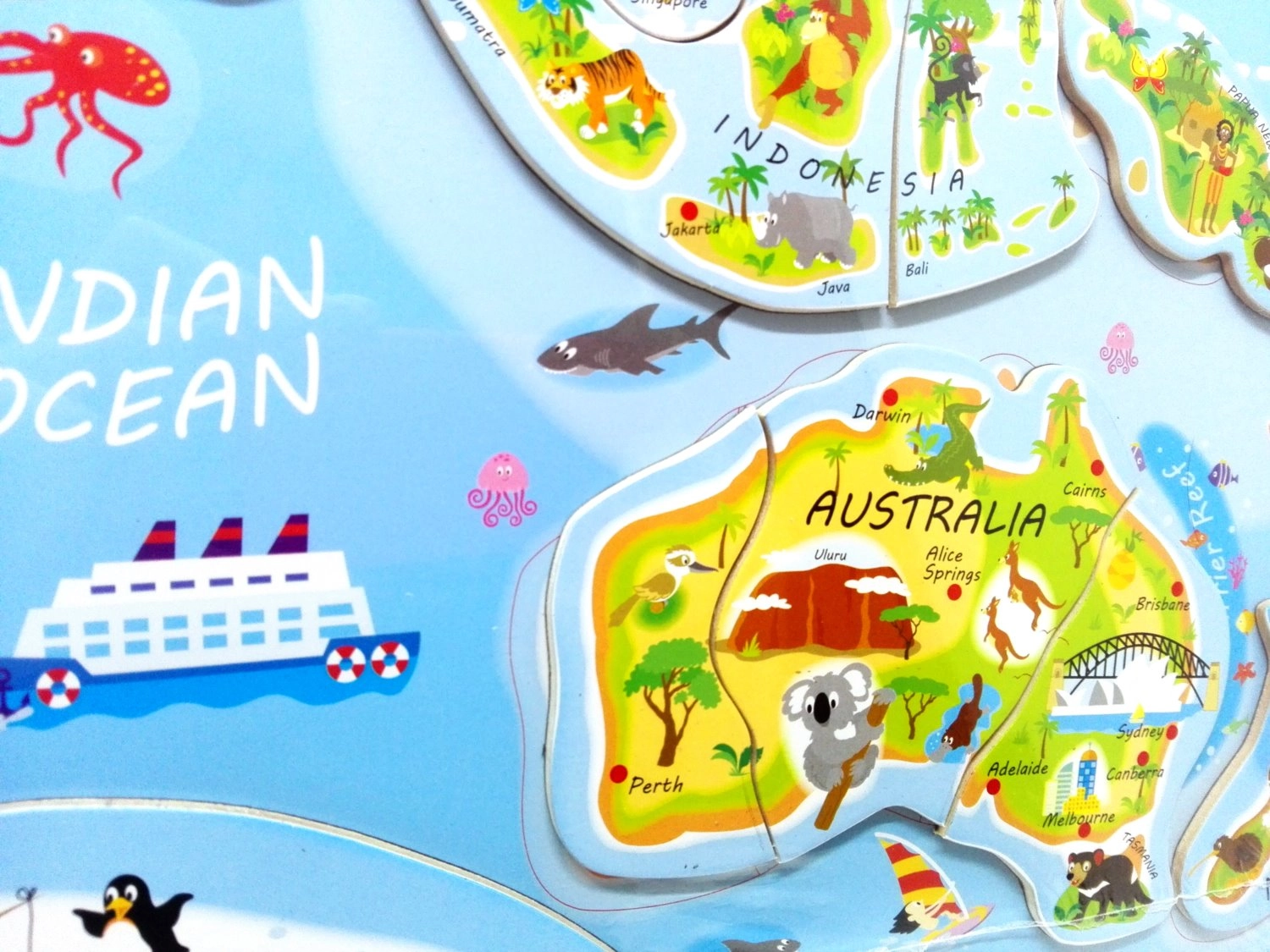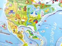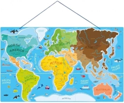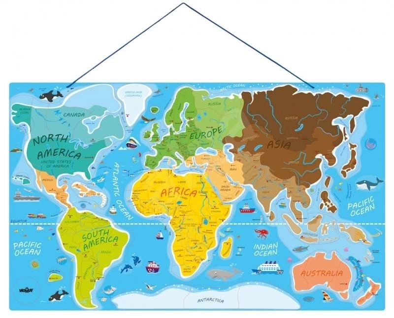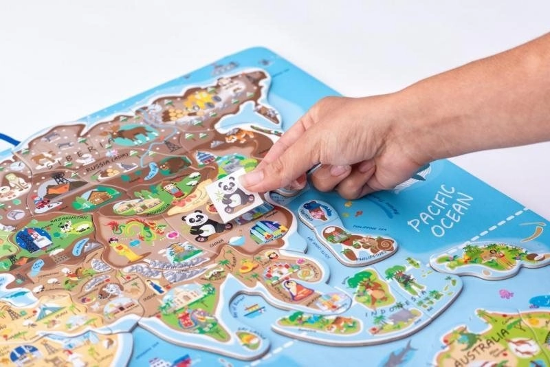 Šī magnētiskā pasaules karte ir lielisks rīks bērniem, lai rotaļīgi apgūtu valstis un kontinentus. Apakšējo slāni veido vienkāršota politiskā karte, uz kuras bērni piestiprina puzles gabaliņus. Viņi apgūst ģeogrāfisko novietojumu un atsevišķu valstu raksturojumu, tostarp šo reģionu faunu.