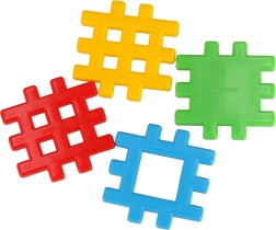 Detaļas ar izmēru aptuveni 10,5 × 10,5 cm un režģveida fiksatoru ir ērti satveramas un droši savienojamas – perfekti mazām rociņām no 2 gadu vecuma.