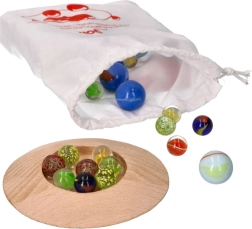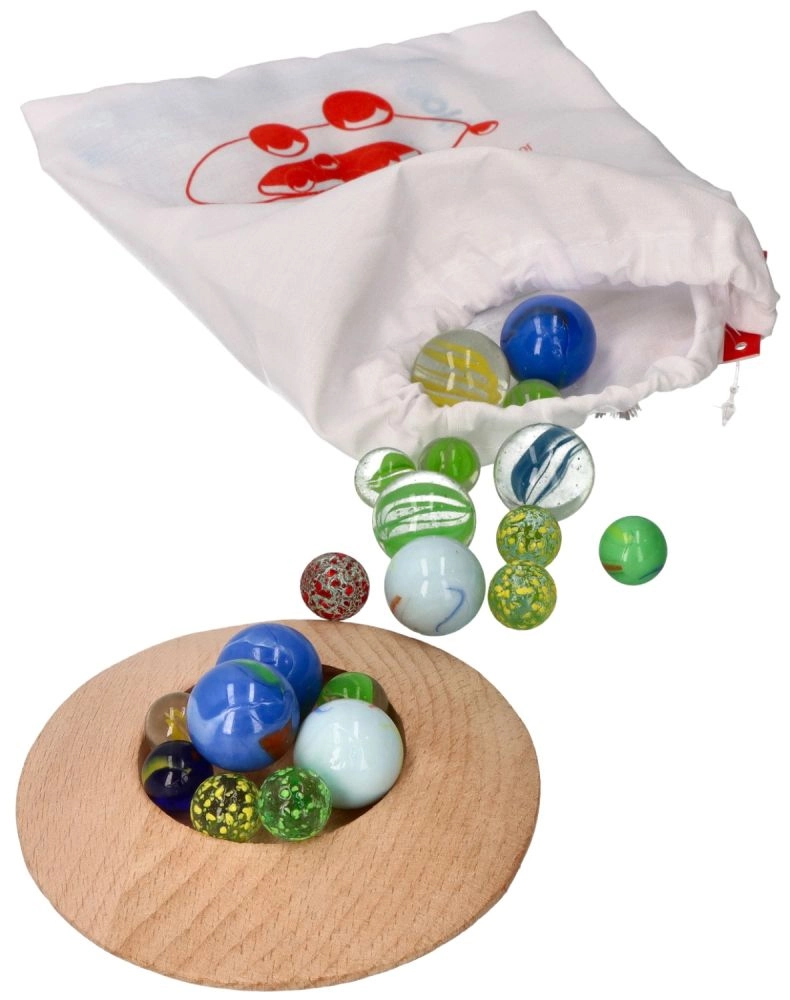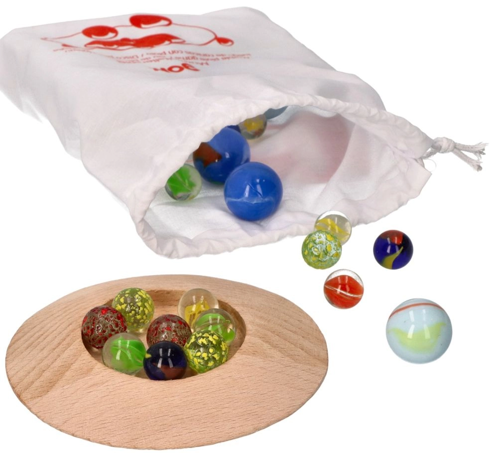 Ņemiet līdzi savas iecienītās bumbiņas jebkur ar praktisko kokvilnas maisiņu. Šajā komplektā ir 31 dažādkrāsaina stikla bumbiņa un koka iedobe, kas padara to par ideālu izvēli spēlēm telpās. Veicina radošumu un attīsta bērnu smalko motoriku. Kurš būs visveiklākis un iemetīs iedobē visvairāk bumbiņu?