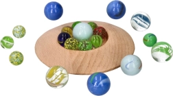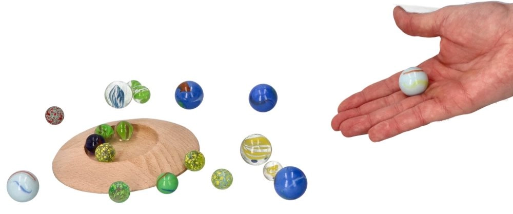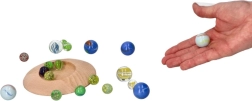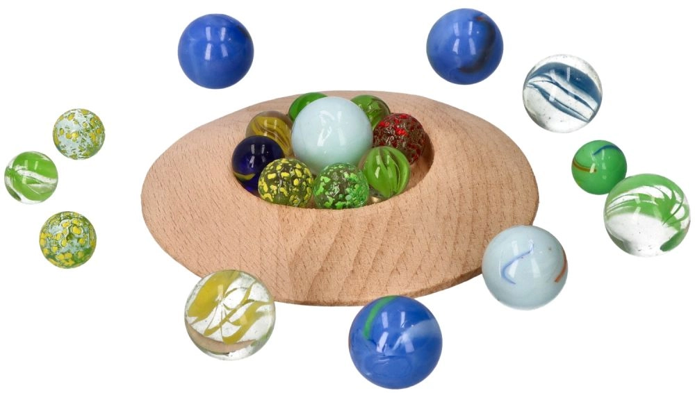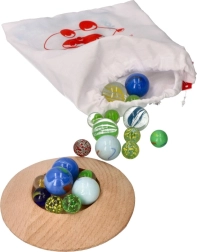 Komplektā ir 31 dažādu krāsu un izmēru stikla bumbiņa daudzveidīgai spēlei.