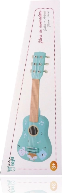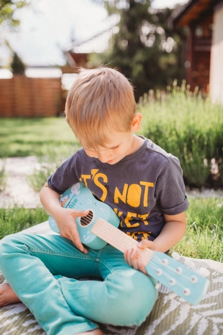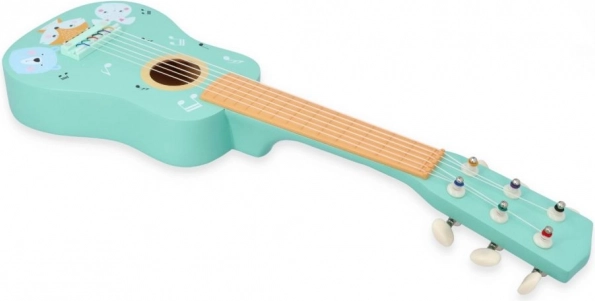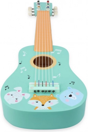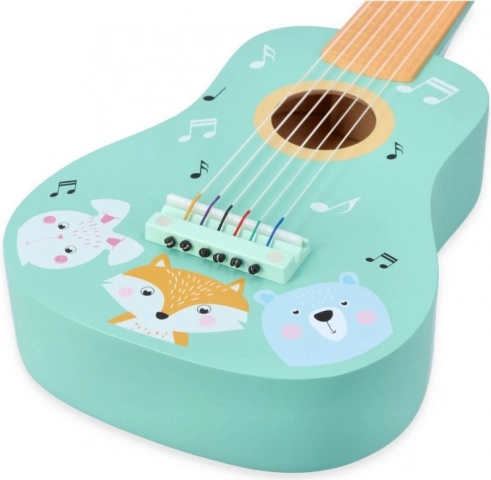 Mīlīga koka bērnu ģitāra tirkīza krāsā ar dzīvnieciņu ilustrācijām motivē mazos mūziķus atklāt mūzikas pasauli. Tā piedāvā izturīgu koka korpusu, īstās stīgas un ērtu satvērienu, tāpēc ir ideāla pirmajiem mēģinājumiem un ritma izjūtas un kreativitātes attīstīšanai.