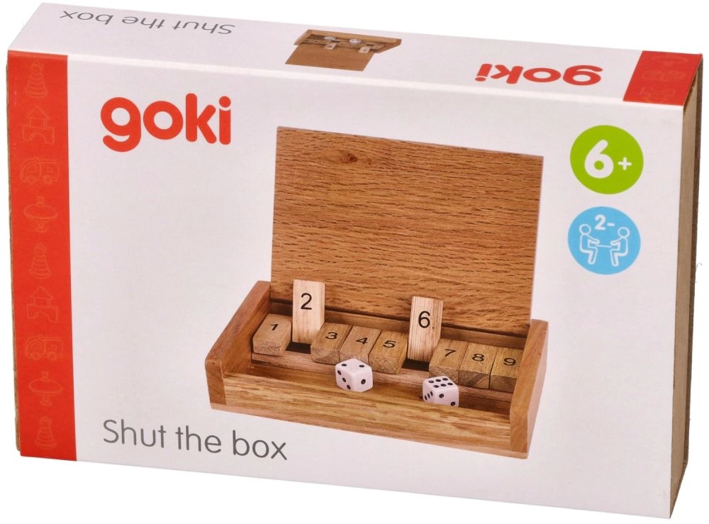 Kompakta koka spēle Shut the Box no Goki ir ideāla gan ceļā, gan mājās. Pateicoties diviem metamajiem kauliņiem un atlokāmām plāksnītēm 1–9, tā attīsta skaitīšanu, strategu domāšanu un koncentrēšanos. Spēlē 2 un vairāk spēlētāju, mērķis ir aizvērt pēc iespējas vairāk skaitļu un panākt zemāko atlikuma summu uz palikušajām plāksnītēm.