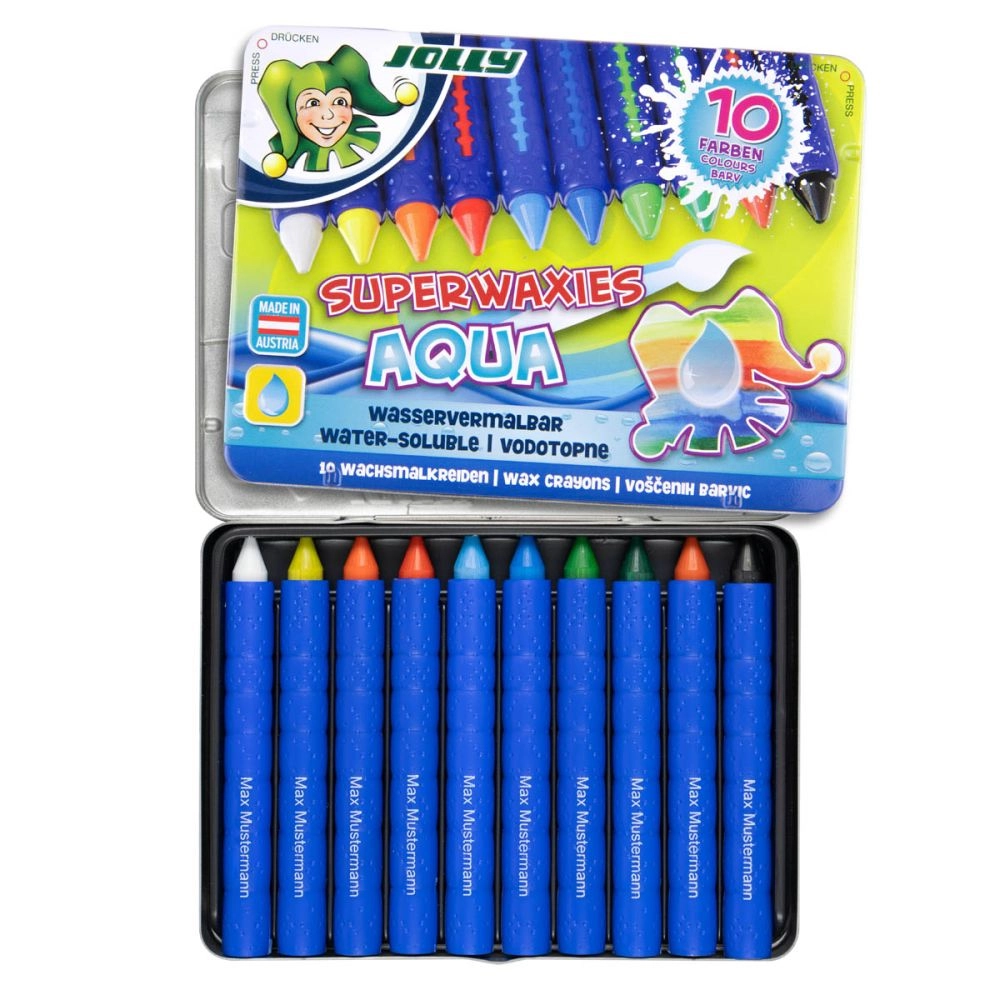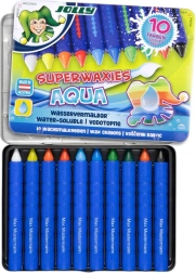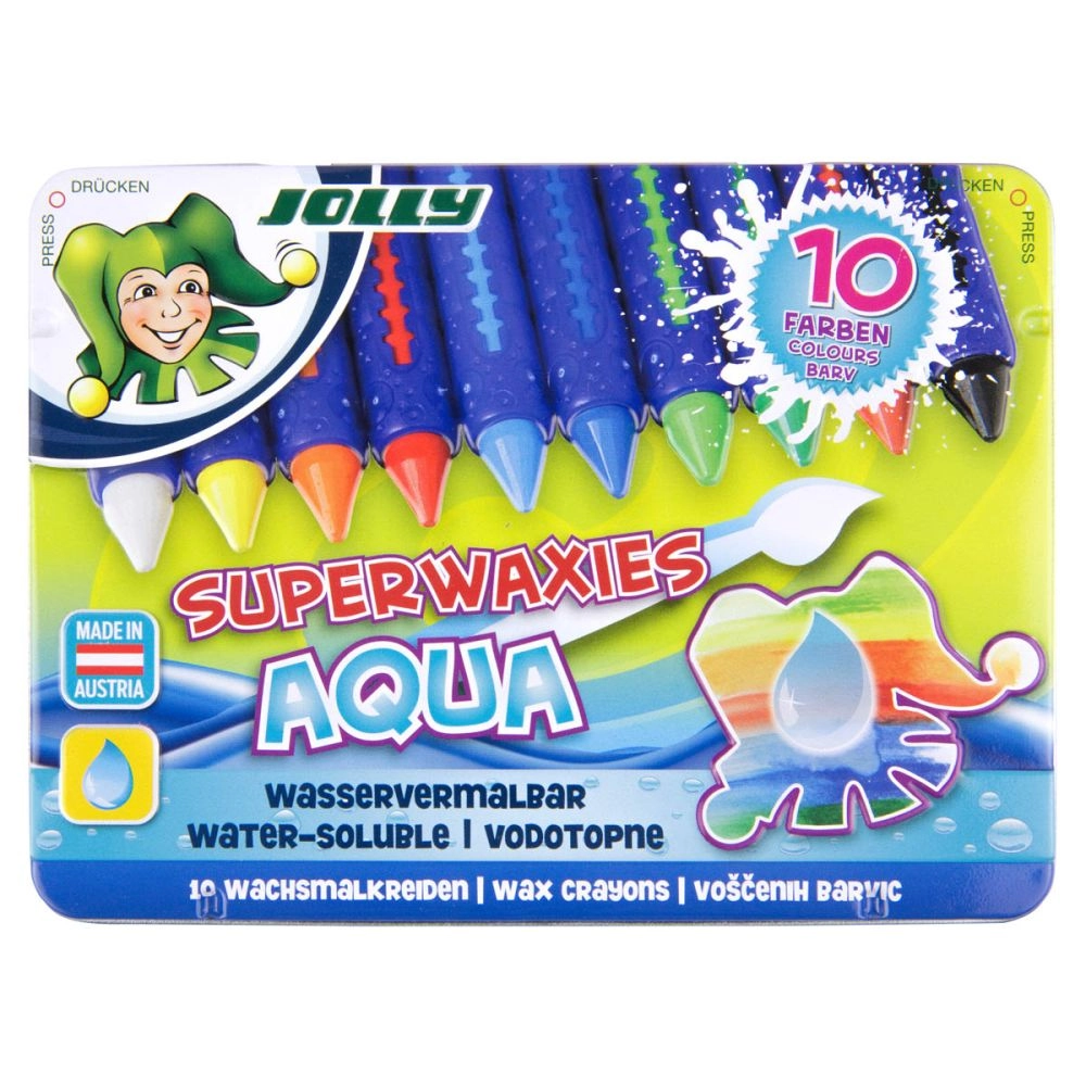 Nesalaužami vaska krītiņi AQUA praktiskā metāla kārbiņā mazajiem radītājiem no 3 gadu vecuma. Tie piedāvā spilgtas un piesātinātas krāsas, ir izturīgi pret lūšanu un atbilst CE sertifikācijai. Pateicoties kompaktajiem izmēriem 14 × 10 cm, tie viegli ietilpst mugursomā vai penālī.