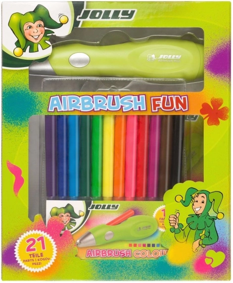 JOLLY aerogrāfa pildspalva pārvērš jebkuru papīru, kartonu vai tekstilu oriģinālā darbā. Pateicoties elektriskai krāsas izsmidzināšanai, bez piepūles panāksiet plūdenas pārejas, ēnošanu un precīzas līnijas. Aizraujošie šabloni ar burtiem, cipariem un motīviem atvieglo sākumu un veicina bērnu fantāziju.