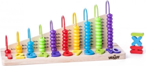 Komplektā ietilpst koka skaitāmais rāmis un 13 izņemami krāsaini bloki ciparu un simbolu +, - un = veidā.