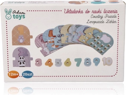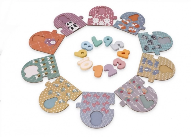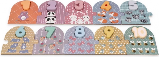 Šī kvalitatīvā koka puzle apvieno izklaidi un mācīšanos. Katram ciparam no 1–10 ir sava plāksnīte ar mīlīgiem dzīvnieciņiem atbilstošā skaitā, lai bērns viegli saprastu saikni starp ciparu un daudzumu. Izvirzītie, krāsainie cipari ērti turami mazās rociņās un veicina sīkās motorikas un vizuālās uztveres attīstību.