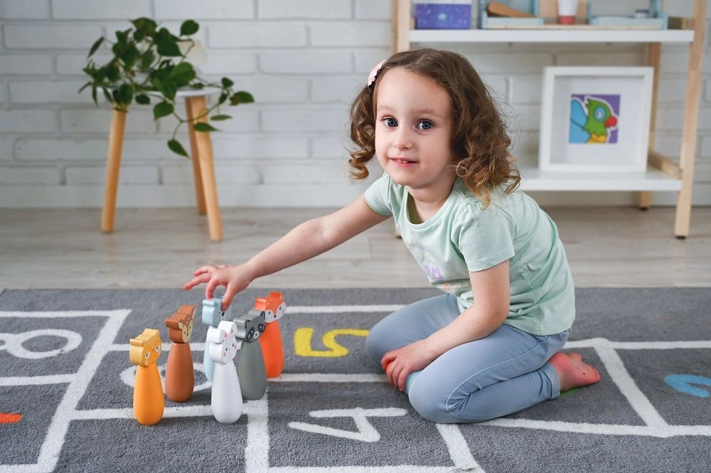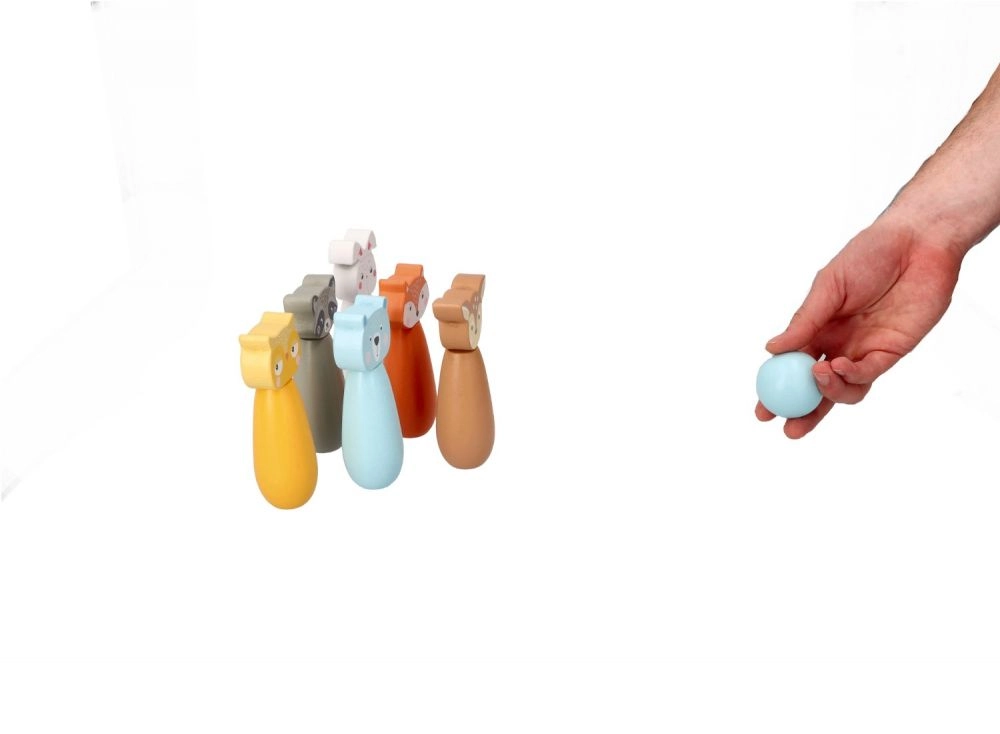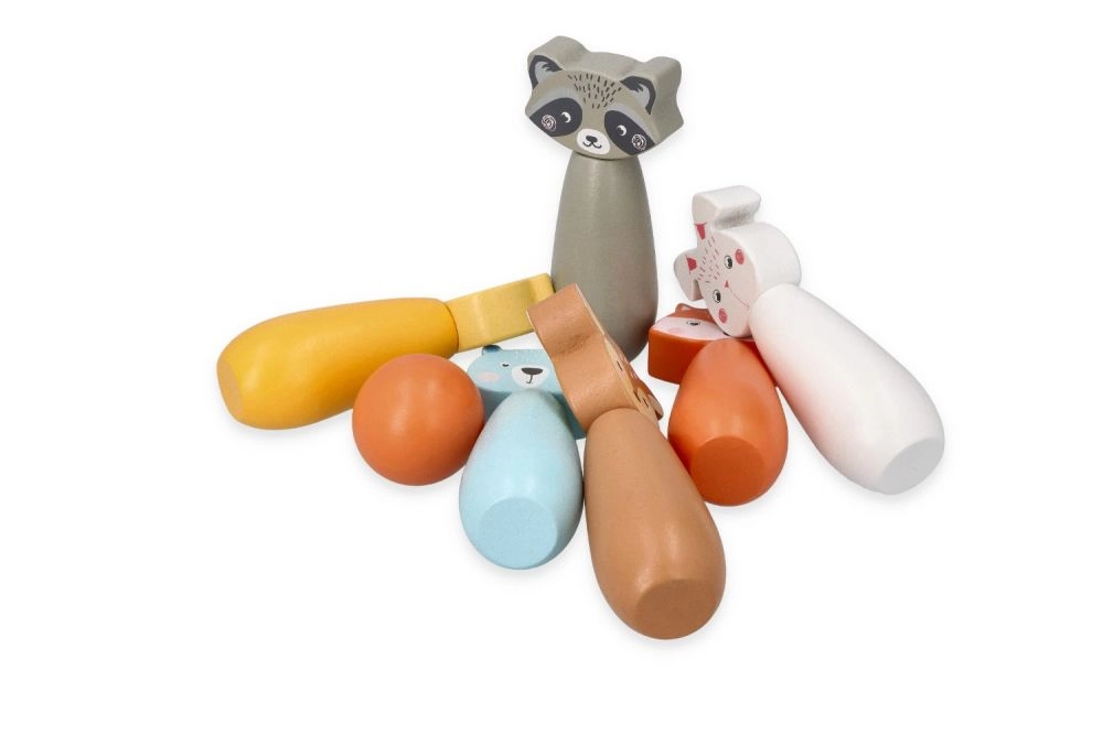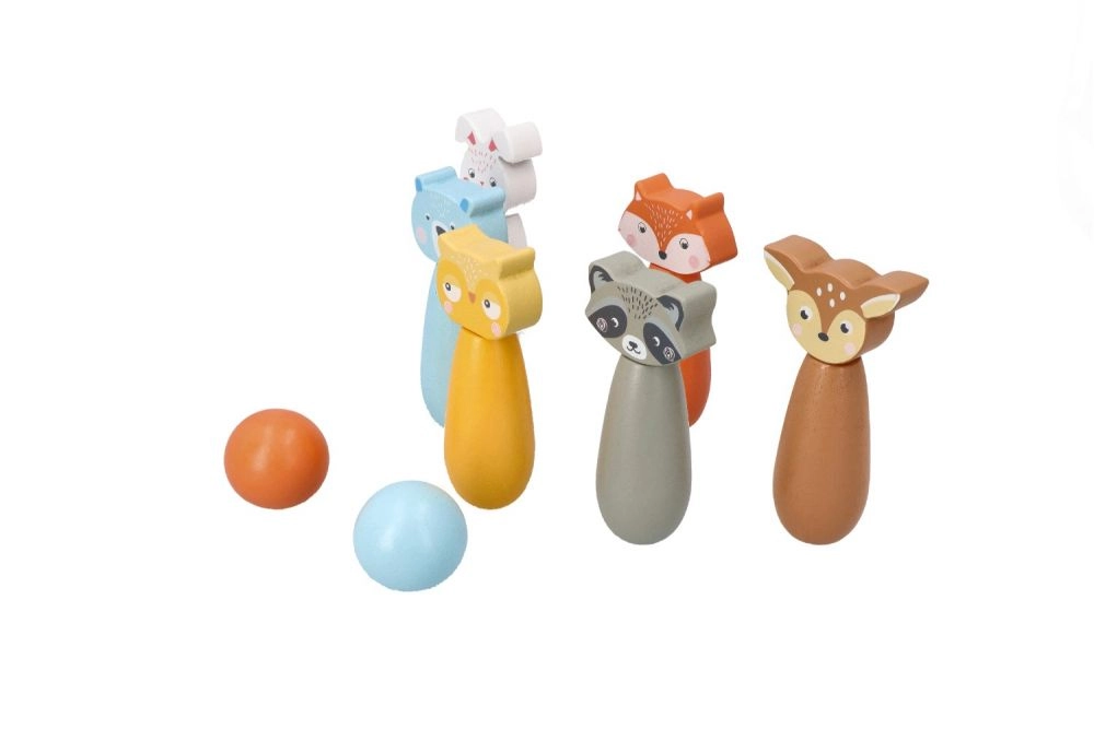 Atklājiet rotaļīgu koka keglīšu komplektu ar mīlīgiem meža dzīvnieku motīviem, kas pārvērtīs jebkuru telpu mazā boulinga laukumā. Pateicoties kompaktajiem izmēriem, tas lieliski der bērnistabai un viesistabai, kā arī izmantošanai dārzā. Spēlējot bērni trenē precizitāti, koncentrēšanos un veselīgu sacensības garu.
