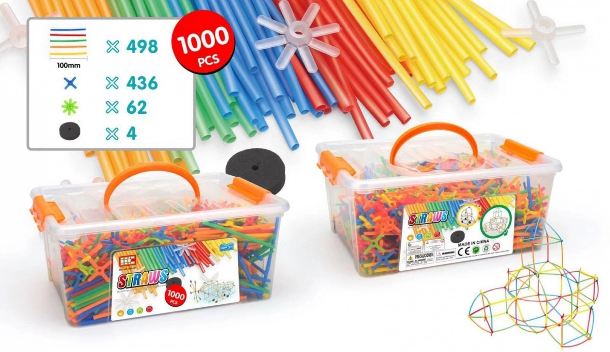 Mazāko Ģēniju konstrukciju komplekts ar mazām salmiņām ļauj bērniem veidot dažādas formas, izmantojot krāsainas savienojošās kātiņas un krustiņus.