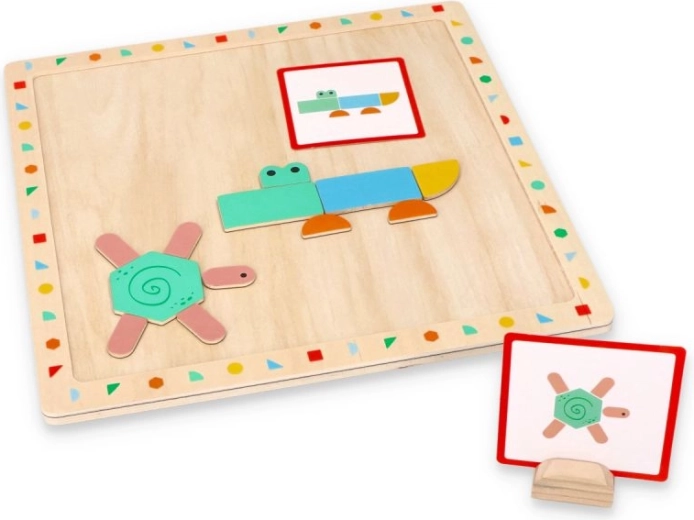Šī magnētiskā puzle apvieno krāsainas ģeometriskas formas un paraugu kartītes, lai bērni varētu veidot dzīvniekus, priekšmetus un arī savus attēlus. Koka pamatne ar izgriezumu kartītei notur paraugu vietā, ļaujot bērniem labāk koncentrēties uz veidošanu un attīstīt iztēli.