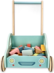 Krāsainie koka klucīši attīsta sīko motoriku, iztēli un loģisko domāšanu. Ratiņi kalpo kā praktiska vieta klucīšu un gatavo būvju glabāšanai.