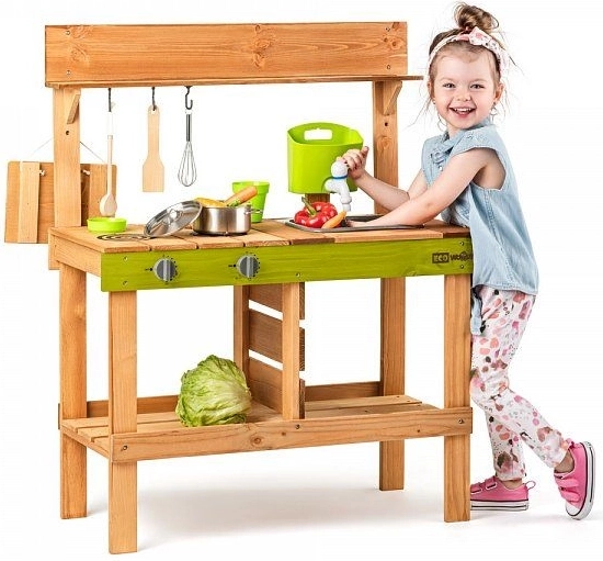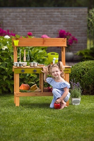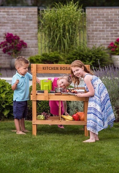 Pateicoties košajiem zaļajiem akcentiem, virtuve lieliski iederas dārzā un veicina maņu rotaļas ar ūdeni, zemi un lapām. Tā ir ideāli piemērota bērniem no 3 gadu vecuma un palīdz attīstīt iztēli, lomspēles un sociālās prasmes.