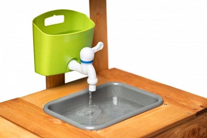 Plastmasas izlietne ar baltu krānu un tvertni bērniem ļauj droši liet un izlīt ūdeni, mācot higiēnas pamatus un kārtības uzturēšanu rotaļās.