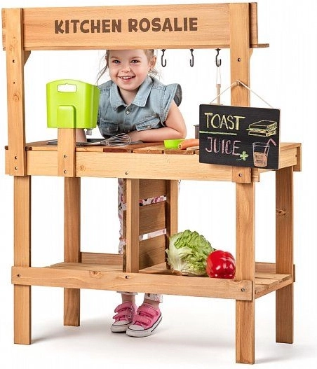 Koka virtuve Rosalie bērniem piedāvā reālistisku vietu “gatavošanai” – no maisīšanas un mazgāšanas plastmasas izlietnē līdz pasniegšanai uz darba virsmas. Izturīgā koka un plastmasas kombinācija ir piemērota lietošanai ārā, savukārt āķi un plauktiņi palīdz uzturēt traukus un “sastāvdaļas” pārskatāmi pa rokai.