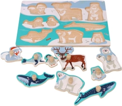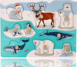 Atklājiet jautru un izglītojošu koka puzli ar rokturiem ar arktisko dzīvnieku motīvu. Pateicoties lielajiem koka pogrokturiem, gabaliņus viegli satvert pat pašiem mazākajiem bērniem; tie attīsta sīko motoriku, roku–acu koordināciju un dzīvnieku atpazīšanu. Ideāla pirmā puzle bērniem no 12 mēnešu vecuma.