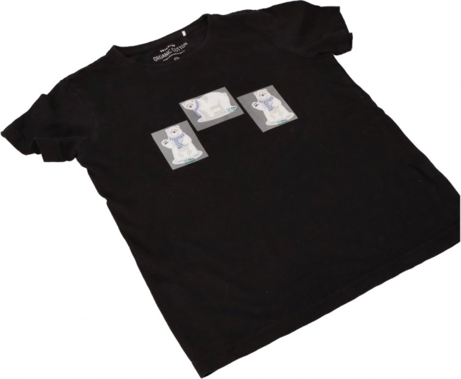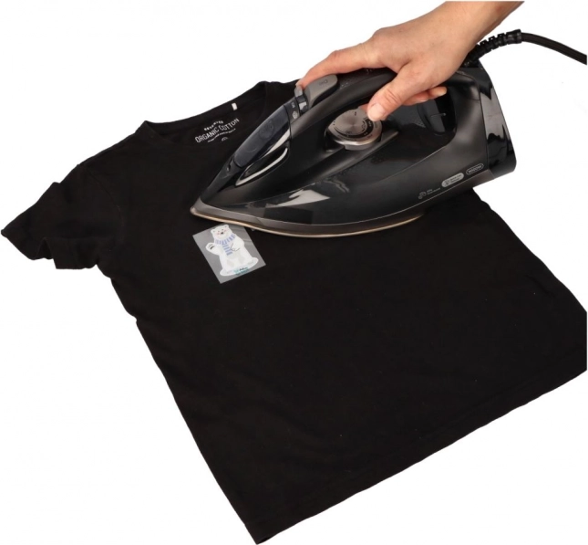 Kā rīkoties: izgrieziet motīvu, novietojiet izvēlētajā vietā, iestatiet gludekli uz 150–180 °C (bez tvaika) un piespiediet 10–15 s. Pēc atdzišanas noņemiet transferplēvi. Ja nepieciešams, procesu īsi atkārtojiet.