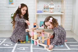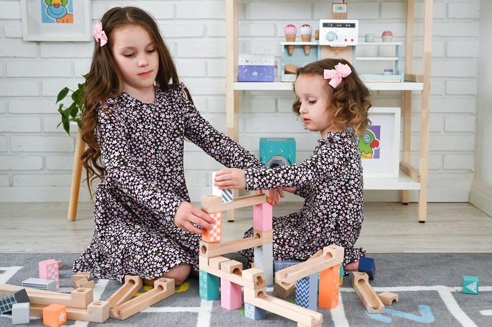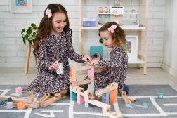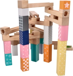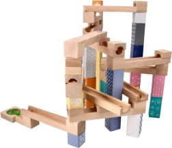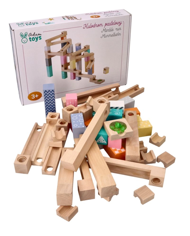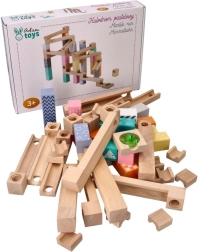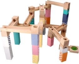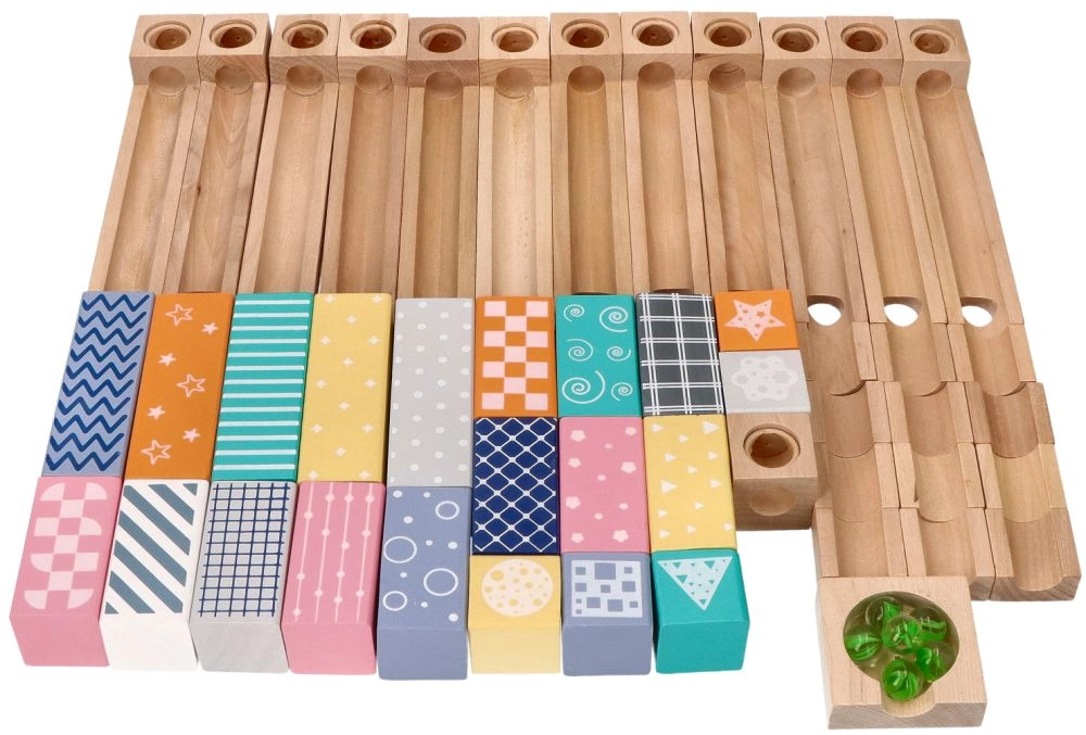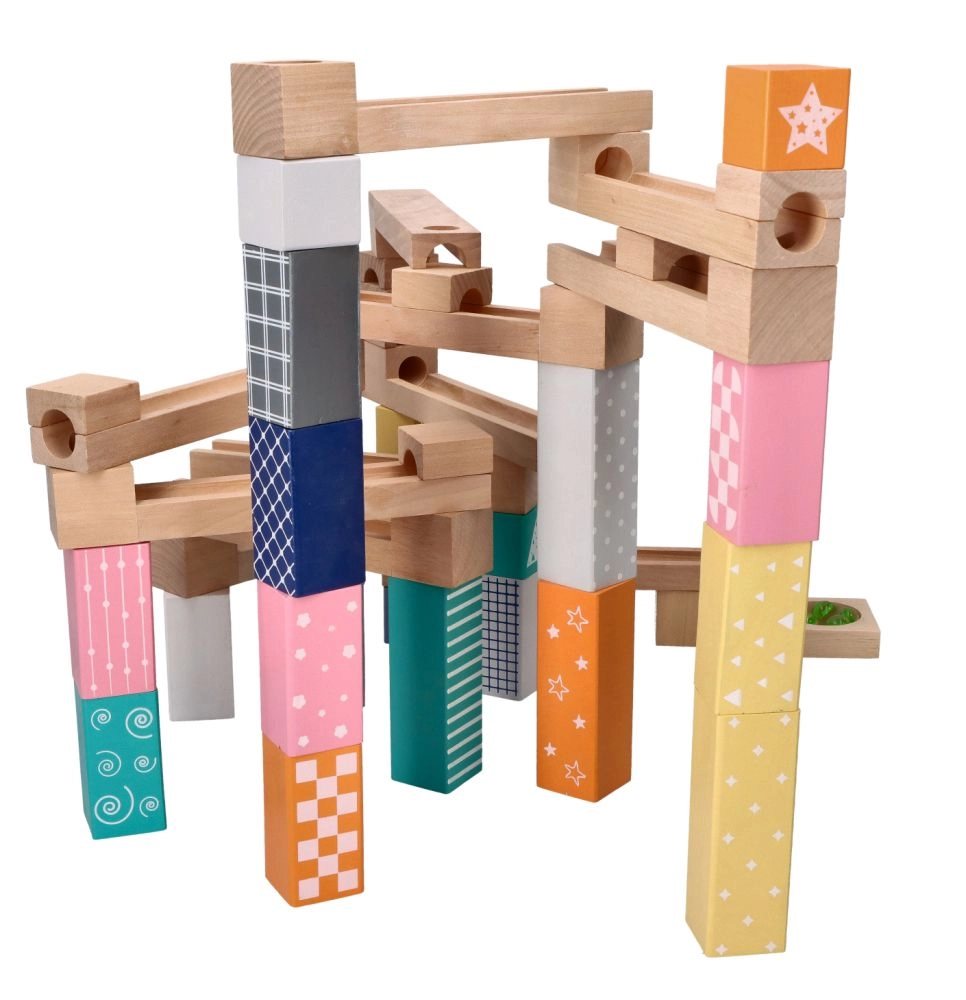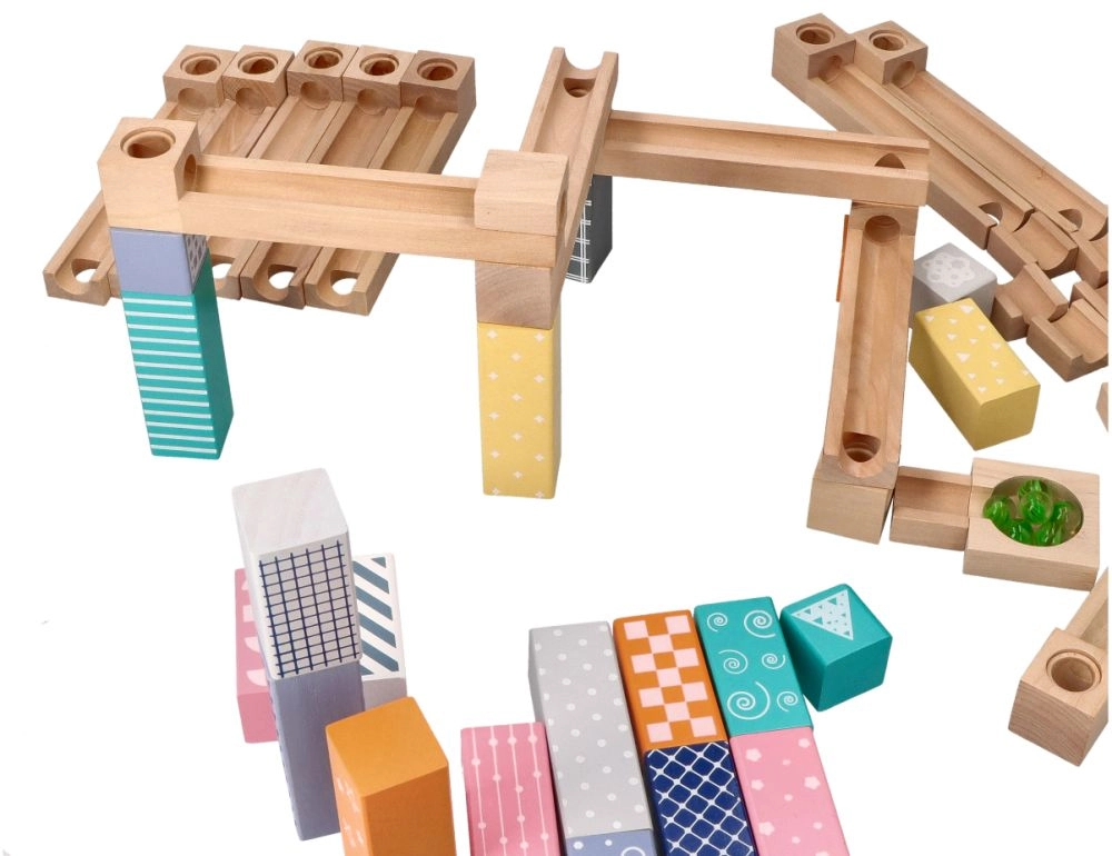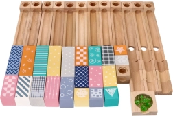 Šī kvalitatīvā koka marmora trase maigos pasteļtoņos ļauj bērniem veidot oriģinālas trases un vērot, kā bumbiņas traucas pa rievām, tiltiņiem un atverēm. Izturīgie koka klucīši ar drukātiem rakstiem sniedz stabilitāti un vizuālu pievilcību, attīstot telpisko iztēli.