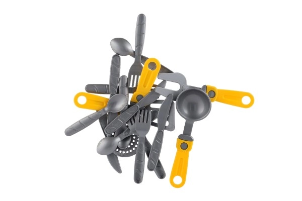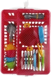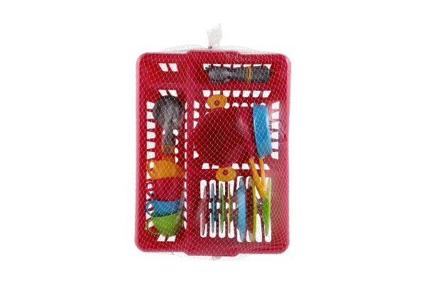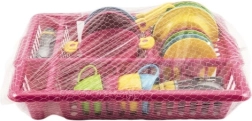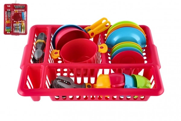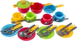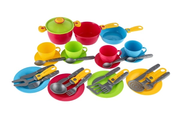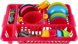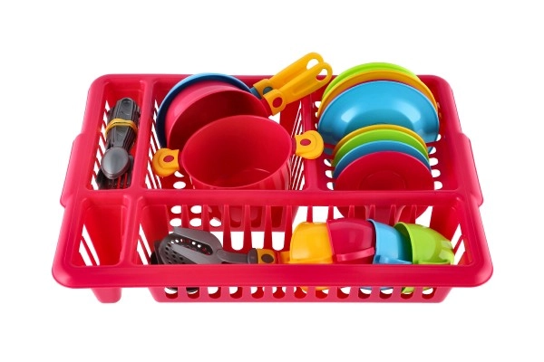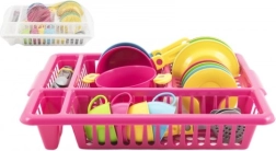 Jautrs bērnu virtuves komplekts ērtā notecinātājā sniedz stundām ilgu radošu izklaidi. Tas ietver visu, kas vajadzīgs mazajiem pavāriem: šķīvjus, tasītes ar apakštasītēm, galda piederumus, katlu ar vāku un pannas. Košās krāsas piesaista uzmanību un attīsta iztēli, sīko motoriku un kārtības ieradumus – pēc “gatavošanas” traukus vienkārši noliek notecinātājā kā pie mammas.