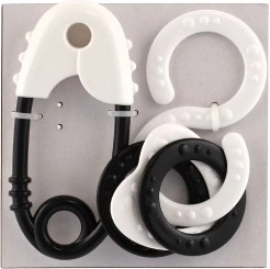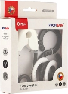 Melnbalto grabuļu komplekts, ideāls mazu bērnu redzes un dzirdes stimulēšanai. Perfekts izmērs bērna rociņām.