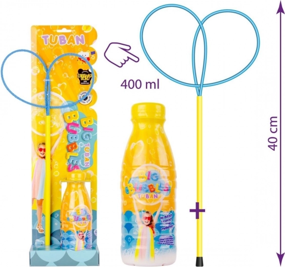 Komplektā ir ne tikai 40 cm augsts aplis ar plastmasas rokturi, bet arī īpašs materiāls, kas uzsūc šķidrumu, nodrošinot vēl labākus burbuļus.